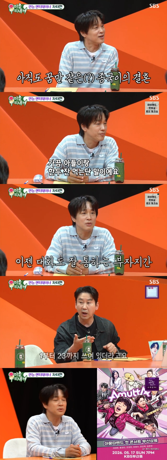 사진=SBS[스포츠투데이김태형기자]배우차태현이김종국의결혼을믿지못한다고밝혔다.26일방송된SBS'미운우리새끼'에는차태현이스페셜MC로출연했다.이날차태현은절친김종국의결혼을아직도가짜라고믿는다는말에"결혼식에서만봤다.그냥세트에서사는것같다"고해웃음을자아냈다.그는"아직신혼집을가본적없다.그집을가기전까지는믿을수없겠다는생각이든다"고말했다.모벤져스가"우리도그렇다"고하자,차태현은"전국민이꿈을꾼것같다"고덧붙였다.그러면서"최근핫한소식은김종국이2세계획을준비하고있다더라.이것또한믿지는않는다"고밝혔다.서장훈은"차태현씨가최고전성기때첫사랑과결혼한걸로유명하다.그럼태어나서지금까지연애를아내분이랑만한거냐"고물었다.차태현은"그렇게돼있다.그런셈"이라며웃었다.그는"다시태어나도지금의아내와결혼하겠냐"는질문에"정말최악의질문이다.빠져나갈구멍이1도없는질문이다.다시태어나서또만나라는거냐.그게뭐가다시태어난거냐"고답해웃음을안겼다.첫째수찬군이스무살이됐다는차태현은"수찬이가예전에는대화가별로없었는데확실히스무살이되니까편해지긴했다.아들이스무살되면같이술먹을생각을했는데,가끔한두잔먹는다.그럼확실히얘기도많이하게된다"고밝혔다."고3때까진무서워하지않았냐"는말에는"이름도잘얘기안했다.이제는이름을당당하게얘기할수있다"고말해웃음을자아냈다.신동엽은"저도딸이대학간다음에는되게편해졌다.학교에서모임이많은데술을꽤마시는것같더라.잘마시는것같아서한번은'얼마나마셨어?'물어봤더니핸드폰을보여주더라.1부터23까지쓰여있었다.소주한잔마실때마다주량을재려고적었다고했다.나중에친구들,선배들다챙겨서택시태워보내고왔다더라"라고밝혀놀라움을안겼다.또한차태현은아묻따밴드보컬로활동하는것에대해"홍경민씨가리더이고베이스를친다.김준현씨가드럼을친다.직장인밴드를만들었는데보컬이프로가수가하면안된다더라.그래서저한테왔다.본인들이가수임에도불구하고직장인밴드이기때문에노래를하면안된다.객원보컬은장혁씨가한다"며"일이커져서5월17일부산에서첫콘서트를한다"고밝혔다.[스포츠투데이김태형기자[email protected]]Copyright©스포츠투데이.무단전재및재배포금지.
