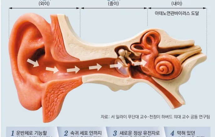 中-美공동연구팀‘네이처’발표개량바이러스를운반체사용…42명중38명이청력회복돼유전성실명-빈혈치료개발자…‘과학계오스카상’나란히수상인류가치료가불가능한것으로여겨졌던난치성유전질환들을서서히정복하고있다.유전질환의원인유전자를교정하는유전자치료기술을활용한치료성과가잇따라나오고있는것.구글을창업한세르게이브린과페이스북을창업한마크저커버그등실리콘밸리의거물들이설립한‘과학계의오스카상’‘실리콘밸리의노벨상’으로불리는‘브레이크스루상’의생명과학부문올해수상자로도유전자치료개척자들이선정됐다.유전자치료의가능성이인정됐다는뜻이다.유전자치료의적용범위가난치성유전질환전반으로빠르게확장되고있다는평가도나온다.●선천성난청질환환자청력회복확인유전자치료는결함있는유전자를고치거나대체해질환의근본원인을없애는접근이다.서일라이중국푸단대부속이비인후과병원교수와천정이미국하버드대의대교수공동연구팀은‘상염색체열성난청9형(DFNB9)’환자42명을대상으로유전자치료제‘AAV1-hOTOF’를투여한다기관임상시험결과를22일(현지시간)국제학술지‘네이처’에발표했다.DFNB9은속귀에서소리를뇌로전달하는단백질오토페를린을만드는오토페를린유전자(OTOF)에돌연변이가생겨발병하는선천성난청이다.소리는귀에들어오지만신호가뇌로제대로전달되지않는‘청각신경병증’의일종이다.어린이청각신경병증환자의약41%에서OTOF돌연변이가발견되지만승인된약물이없어달팽이관에전극을심어소리를전기신호로바꿔주는인공와우이식이사실상유일한선택이다.연구팀은정상오토페를린유전자를바이러스에실어환자의귀에주입하는유전자치료방식을택했다.인체에해를끼치지않도록개량한아데노연관바이러스(AAV)를운반체로써정상유전자를속귀세포안으로들여보낸다.속귀세포는새로들어온정상유전자를바탕으로정상오토페를린단백질을만들어내막혀있던소리신호전달이복구되는원리다.중국8개병원에서0.8세영아부터32.3세성인까지42명을치료한결과38명의청력이회복됐다.소리를들려줬을때뇌가반응하기시작하는최소소리크기는치료전평균97데시벨(dB)에서치료1년뒤54dB,2.5년뒤42dB로계속낮아졌다.일반적으로정상청력은25dB이하다.일부환자는치료닷새만에소리를들었다.0.5∼18세환자의회복이성인보다원활했고어린이참가자중에는속삭이는소리까지듣는사례도나왔다.투여량을더늘리지못하게할만큼심각한독성이나중대한부작용은나타나지않았다.서일라이교수는“이번결과가DFNB9뿐아니라다른유전성난청의유전자치료개발에도귀중한참고가될것”이라고밝혔다.●난치성낭포성섬유증치료가능성도폐·장·췌장등에끈적한점액이쌓이는난치병낭포성섬유증의치료사각지대를유전자치료로공략한연구성과도공개됐다.알레산드로움바흐이탈리아트렌토대연구원과안나체레세토교수연구팀은난치병낭포성섬유증을일으키는CFTR유전자의‘1717-1GA’돌연변이를교정한연구결과를국제학술지‘사이언스중개의학’에22일(현지시간)발표했다.1717-1G>A는CFTR유전자에서염기하나가엉뚱한염기로바뀌는변이다.변이가생기면CFTR단백질이제대로만들어지지않아세포안팎의이온이동이막히고폐·장등에끈적한점액이쌓인다.전체낭포성섬유증환자의약0.8%에서발견되지만아직승인된약이없다.연구팀은유전자를구성하는염기중하나인‘아데닌’을교정하는유전자교정기술로잘못바뀐염기를원래형태로되돌렸다.환자에게서얻은기관지세포로실험실에서만든인공장기에유전자교정도구를적용하자CFTR의이온수송기능이되살아났다.●유전자치료선구자,브레이크스루상대거수상잇단유전자치료성과는비단두연구만의일이아니다.18일미국로스앤젤레스에서열린‘2026브레이크스루상시상식’에서는생명과학상3건중2건이유전자치료선구자들에게돌아갔다.진베넷,앨버트매과이어미국펜실베이니아대명예교수부부와캐서린하이전스파크테라퓨틱스대표는유전성망막질환‘레베르선천흑암시’를치료하는‘럭스터나’를개발한공로로생명과학상을수상했다.2017년미국식품의약국(FDA)승인을받은럭스터나는최초의유전자대체치료제다.스튜어트오킨미국하버드의대·보스턴아동병원교수와스위레이테인미국국립심폐혈액연구소(NHLBI)연구원도태아헤모글로빈이성인헤모글로빈으로바뀌는전환스위치를밝혀겸상적혈구병과베타지중해빈혈을고치는크리스퍼치료제‘카스게비’개발의토대를닦은공로로공동수상자가됐다.아데노연관바이러스(AAV)인간에게병을일으키지않는바이러스로특정조직이나기관에치료유전자를전달하는데쓰인다.대체로면역거부반응이낮아인체내유전자치료에적합하다.임정우동아사이언스기자[email protected]©동아일보.Allrightsreserved.무단전재,재배포및AI학습이용금지