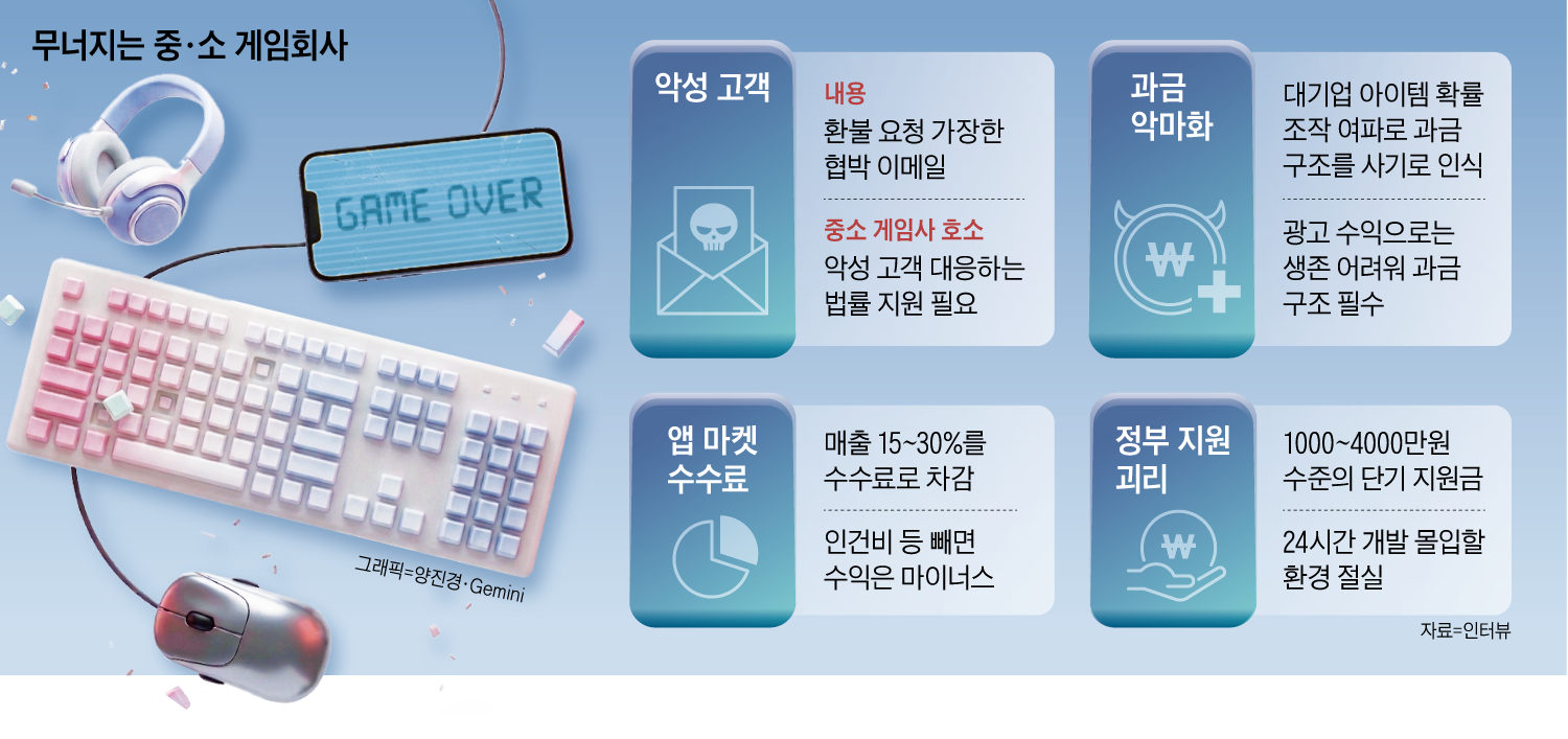 위기감번지는중소게임사“직원20명만있어도어엿한중견이죠.”최근본지와만난중소게임사대표의자조섞인말이다.한때직원100명을거느렸던회사들이이제는5명이하로쪼그라들며,게임산업의‘허리’가빠르게무너지고있다.이용자민원,플랫폼수수료,중국게임공세,정부지원부족이복합적으로작용한결과다.업계에서는“앞으로5년안에대기업과일부인디를제외하면대부분사라질것”이라는위기감이퍼지고있다.◇매출나도적자…“벌수록손해구조”중소게임사대표A씨는게임업데이트전날쉽게잠을이루지못한다.업데이트때마다환불요구나신고를언급하는이용자들의압박이이어지며스트레스가상당하다는것이다.“환불하지않으면유튜버에제보하겠다”거나“공정위에신고하겠다”는식의메일이반복적으로들어온다.A씨는“작은수정하나에도과금구조문제가불거질수있어항상긴장상태”라고했다.앱마켓수수료도중소게임사에큰압박이다.구글·애플등플랫폼은매출의최대30%(일부15%)를가져간다.여기에퍼블리셔수수료와마케팅비용이더해지면수익을내기어려운구조가된다.개발기간이길어질수록인건비부담이커지는점까지감안하면구조적으로흑자를내기어렵다는것이업계설명이다.2019년직원100명을뒀다가현재4명만남은중소게임사팡스카이는지난10년간앱마켓에약150억원의수수료를지급했다.이병진팡스카이대표는“광고노출조차안되면매출이아예나오지않아마케팅비용까지울며겨자먹기로쓰다보면적자는순식간”이라고말했다.중국게임사역시막대한자본과기술력을앞세워국내앱마켓매출상위권을점령하고있다.외산게임점유율은2024년38%에서2025년52%로급증하며국산게임을빠르게밀어내고있다.◇산업핵심인데…지원은‘생색내기’게임산업은한국콘텐츠산업의핵심축이다.한국은행에따르면지난해콘텐츠산업흑자44억달러중93%를게임이차지했다.사실상콘텐츠수출을떠받치는산업이다.하지만현장에서는정부지원이실효성이떨어진다는지적이많다.서울시가AI(인공지능)기술도입과제작환경고도화를위해추진하는‘2026게임콘텐츠사업화지원사업’의경우분야별로기업당1000만~3000만원정도를지원하지만,현장에서는“현실을모른다”는지적이나온다.실패했을경우다시도전할수있는최소한의‘안전망’을구축하는게더중요하다는것이다.김정윤가천대교수는“개발자가장기간안정적으로몰입할수있는환경과함께모태펀드같은최소한의안전망이필요하다”고말했다.열악한환경속에서도버텨온인재들도한계에이르고있다.투자위축과수익성악화가겹치며폐업이늘고,업계전반의불안감이커지고있다.2025년상반기스타트업및중소기업폐업건수1위는바이오(9건),2위는게임및교육(8건)분야로나타났다.8년업력의잔디소프트(누적투자89억원)와엔퓨전(누적투자55억원)등촉망받던기업들도작년상반기줄줄이문을닫았다.인재들의희망지표도바닥을쳤다.한국콘텐츠진흥원이발간한‘2025대한민국게임백서’에따르면,게임사직원의‘창업의향없음’응답은2022년31.9%에서2024년74.2%로2년만에두배넘게치솟았다.Copyright©조선일보.무단전재및재배포금지.