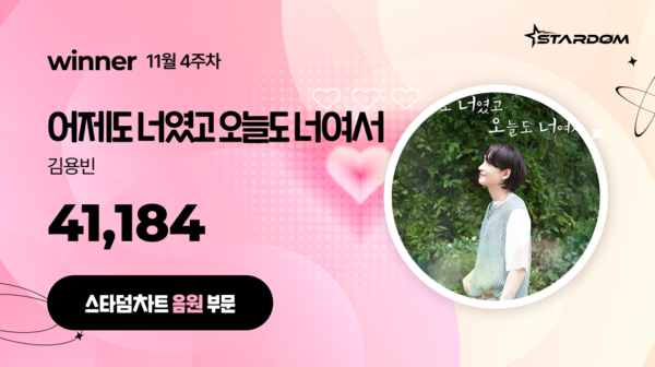 ▲김용빈'어제도너였고오늘도너여서'가11월넷째주'스타덤차트'음원부문주간랭킹에서1위를차지한투표결과이미지.제공|스타덤[스포티비뉴스=김원겸기자]김용빈'어제도너였고오늘도너여서'가10주연속주간최고인기곡으로꼽혔다.김용빈'어제도너였고오늘도너여서'는11월4주차(집계기간11월24일~11월30일)'스타덤차트'음원부문주간랭킹에서1위를차지했다.9월4주차에음원부문주간랭킹1위에오른이후10주연속정상등극이다.김용빈'어제도너였고오늘도너라서'는집계기간동안4만1184표를얻어11월셋째주최고인기곡으로인정받았다.강문경'매우'는3만1360표를얻어2위를기록했다.3위는3488표를얻은박서진'당신이야기'이다.한편11월4주차'스타덤차트'트로트부문에서는강문경이15주연속1위를차지하던김용빈을누르고처음으로정상에올랐다.아이돌부문에서는피프티피프티가6주연속1위를차지했고,배우부문에서는김수현이7주연속1위를기록했다.다양한부문의랭킹을보여주는'스타덤'은스타와팬들을연결해주는모바일애플리케이션으로,'나의최애셀럽을우주대스타로만든다'는캐치프레이즈아래스타와팬들을다양한방식으로연결한다.<저작권자ⓒSPOTVNEWS.무단전재및재배포금지>Copyright©스포티비뉴스.무단전재및재배포금지.