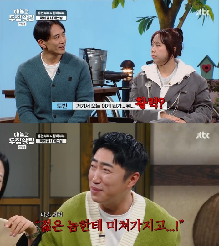 ‘대놓고두집살림’.사진IJTBC‘대놓고두집살림’방송캡처배우백도빈이인테리어디자이너제이쓴을질투했다.25일방송된JTBC‘대놓고두집살림’에서는홍현희,제이쓴부부와두집살림을하는백도빈,정시아부부의모습이그려졌다.이날정시아는제이쓴과꽃게잡이에나섰다.정시아는제이쓴의칭찬에힘입어꽃게떼기에열을올렸다.정시아는“남편이있을때와없을때의내가다르다.남편이있으면다해주니까‘어떻게해야하냐’이렇게되는데남편이없으니까‘내가해야한다’라는생각이든다”고이야기했다.백도빈은“아내의의외의모습을본게있냐”는질문에“제이쓴이어리니까거기서오는활력을느끼는모습을보고놀랐다”고답했다.장동민이“젊은놈한테미쳐서”라고의역하자백도빈은“이야기가그렇게되나”라고당황해웃음을자아냈다.한편‘대놓고두집살림’은매주화요일오후8시50분방송된다.[이세빈스타투데이객원기자]Copyright©스타투데이.무단전재,재배포및AI학습이용금지