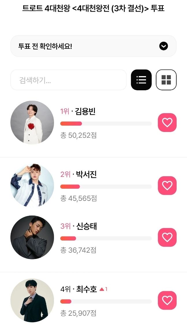 3차결선27일오후2시투표마감4·5위최수호·에녹경쟁도치열뉴욕·도쿄·방콕·서울4개국광고초대천왕'2026K-엑스포'시상'트로트4대천왕'3차전투표중간집계[서울=뉴시스]최지윤기자='트로트4대천왕전'경쟁이치열하다.김용빈은24일오전8시기준팬덤플랫폼스타덤(STARDOM)트로트4대천왕3차결선'4대천왕전'에서5만252점으로1위를유지했다.2위박서진(4만5565점)과약5000점차로,점점격차를벌리고있는상태다.두사람은TV조선'미스터트롯3'와MBN'현역가왕2'우승자로자존심대결을벌이고있다.김용빈은1차예선6위,2차준결선5위에그쳤으나,3차전부터선두를달리기시작했다.박서진은1·2차에이어3차전도2위를유지했다.신승태는3만6742점으로3위를차지했다.1·2차전모두1위에올랐으나,3차전에서조금뒤쳐진상황이다.4·5위경쟁도치열하다.4위최수호는2만5907점,5위에녹은2만5372점으로엎치락뒤치락하고있다.6~8위는진해성(1만4657점),김준수(9234점),강문경(5643점)순이다.4대천왕전투표는27일오후2시마감할예정이다.결승인'초대천왕전'은다음달2~15일투표,최종1위를가릴계획이다.4대천왕전진출자4대천왕은뉴시스의내년창립25주년기념글로벌프로젝트다.팬들이직접트로트대표4인을뽑으며,미국뉴욕타임스퀘어를비롯해일본도쿄,태국방콕,서울등주요도심전광판디지털광고를집행한다.왕중왕격인'초대천왕'1명은'제8회뉴시스한류엑스포'(2026K-엑스포)무대에서시상한다.1990년대홍콩대중음악계를대표한4대천왕콘셉트에서착안했다.트로트가세대를초월한국민장르로자리잡은만큼,팬이스타가치를만들어가는참여형시상브랜드로기획했다.투표는스타덤앱에서진행하며,예선부터초대천왕전까지총4단계로구성했다.100%팬투표로이뤄지며,무·유료투표모두가능하다.무료투표는1회당실버스타10개,유료투표는1회당골드스타4개사용된다.앱에서광고시청,출석체크,미션참여등을통해실버스타획득이가능하다.공정성과몰입도를높이기위해각라운드종료후인터미션(휴식기)기간을두고집계·순위검증을거친다.팬이주도하는투표문화를정착,트로트장르글로벌확산에기여할것으로기대된다.☞공감언론뉴시스[email protected]©뉴시스.무단전재및재배포금지.