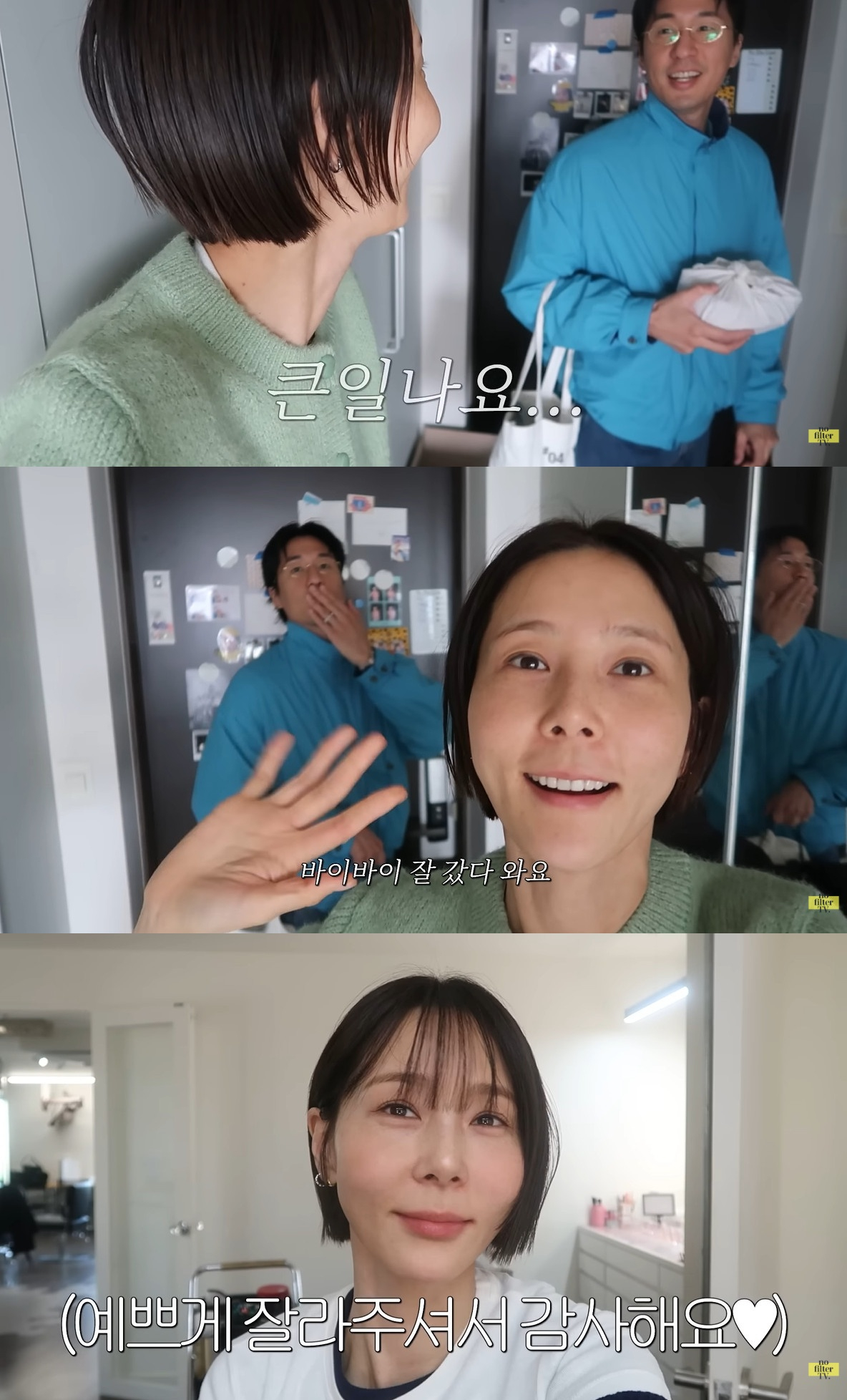[스타뉴스|안윤지기자]/사진=유튜브채널'김나영의노필터TV'영상캡처방송인김나영이남편이자화가마이큐와달달한일상을보냈다.23일유튜브채널'김나영의노필터TV'에서는"깨소금냄새솔솔나는나영이네집밥모음zip마이큐도시락,유부초밥,바질김밥,미역국등등"란제목의영상이게재됐다.이날김나영은출근하는마이큐를배웅하다가"손흥민선수좀닮지않았나"라고말했다.그러자마이큐는"큰일난다.지금대한민국영웅을.."이라며장난스러운답변을내놨다.또한두사람은5번씩인사하며서로에대한애정을드러냈다.또한그는마이큐의도시락을챙기면서"손가락하트를좀자제할수있을까.너무아저씨같다.요즘사람중에손가락하트하는사람이어딨나"라고말했다.그러자마이큐는"난유행을따르지않는다"라며당당한모습을보였다.마이큐는아들신우의농구대회에도함께했다.신우가트로피를받았을때도함께하며기쁨을누렸다.김나영은아들이준에대해"덕분에형이우승했다.잘기다려줘서그렇다"라고하자,이준도"내가아니었으면꼴등이었다"라며행복한미소를지었다.안윤지기자[email protected]©스타뉴스&starnewskorea.com,무단전재및재배포금지