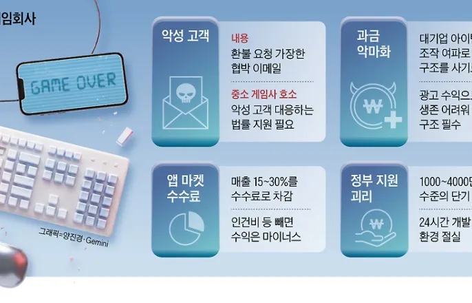 위기감번지는중소게임사“직원20명만있어도어엿한중견이죠.”최근본지와만난중소게임사대표의자조섞인말이다.한때직원100명을거느렸던회사들이이제는5명이하로쪼그라들며,게임산업의‘허리’가빠르게무너지고있다.이용자민원,플랫폼수수료,중국게임공세,정부지원부족이복합적으로작용한결과다.업계에서는“앞으로5년안에대기업과일부인디를제외하면대부분사라질것”이라는위기감이퍼지고있다.◇매출나도적자…“벌수록손해구조”중소게임사대표A씨는게임업데이트전날쉽게잠을이루지못한다.업데이트때마다환불요구나신고를언급하는이용자들의압박이이어지며스트레스가상당하다는것이다.“환불하지않으면유튜버에제보하겠다”거나“공정위에신고하겠다”는식의메일이반복적으로들어온다.A씨는“작은수정하나에도과금구조문제가불거질수있어항상긴장상태”라고했다.앱마켓수수료도중소게임사에큰압박이다.구글·애플등플랫폼은매출의최대30%(일부15%)를가져간다.여기에퍼블리셔수수료와마케팅비용이더해지면수익을내기어려운구조가된다.개발기간이길어질수록인건비부담이커지는점까지감안하면구조적으로흑자를내기어렵다는것이업계설명이다.2019년직원100명을뒀다가현재4명만남은중소게임사팡스카이는지난10년간앱마켓에약150억원의수수료를지급했다.이병진팡스카이대표는“광고노출조차안되면매출이아예나오지않아마케팅비용까지울며겨자먹기로쓰다보면적자는순식간”이라고말했다.중국게임사역시막대한자본과기술력을앞세워국내앱마켓매출상위권을점령하고있다.외산게임점유율은2024년38%에서2025년52%로급증하며국산게임을빠르게밀어내고있다.◇산업핵심인데…지원은‘생색내기’게임산업은한국콘텐츠산업의핵심축이다.한국은행에따르면지난해콘텐츠산업흑자44억달러중93%를게임이차지했다.사실상콘텐츠수출을떠받치는산업이다.하지만현장에서는정부지원이실효성이떨어진다는지적이많다.서울시가AI(인공지능)기술도입과제작환경고도화를위해추진하는‘2026게임콘텐츠사업화지원사업’의경우분야별로기업당1000만~3000만원정도를지원하지만,현장에서는“현실을모른다”는지적이나온다.실패했을경우다시도전할수있는최소한의‘안전망’을구축하는게더중요하다는것이다.김정윤가천대교수는“개발자가장기간안정적으로몰입할수있는환경과함께모태펀드같은최소한의안전망이필요하다”고말했다.열악한환경속에서도버텨온인재들도한계에이르고있다.투자위축과수익성악화가겹치며폐업이늘고,업계전반의불안감이커지고있다.2025년상반기스타트업및중소기업폐업건수1위는바이오(9건),2위는게임및교육(8건)분야로나타났다.8년업력의잔디소프트(누적투자89억원)와엔퓨전(누적투자55억원)등촉망받던기업들도작년상반기줄줄이문을닫았다.인재들의희망지표도바닥을쳤다.한국콘텐츠진흥원이발간한‘2025대한민국게임백서’에따르면,게임사직원의‘창업의향없음’응답은2022년31.9%에서2024년74.2%로2년만에두배넘게치솟았다.Copyright©조선일보.무단전재및재배포금지.
