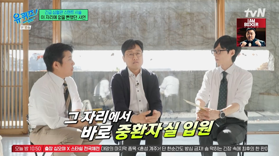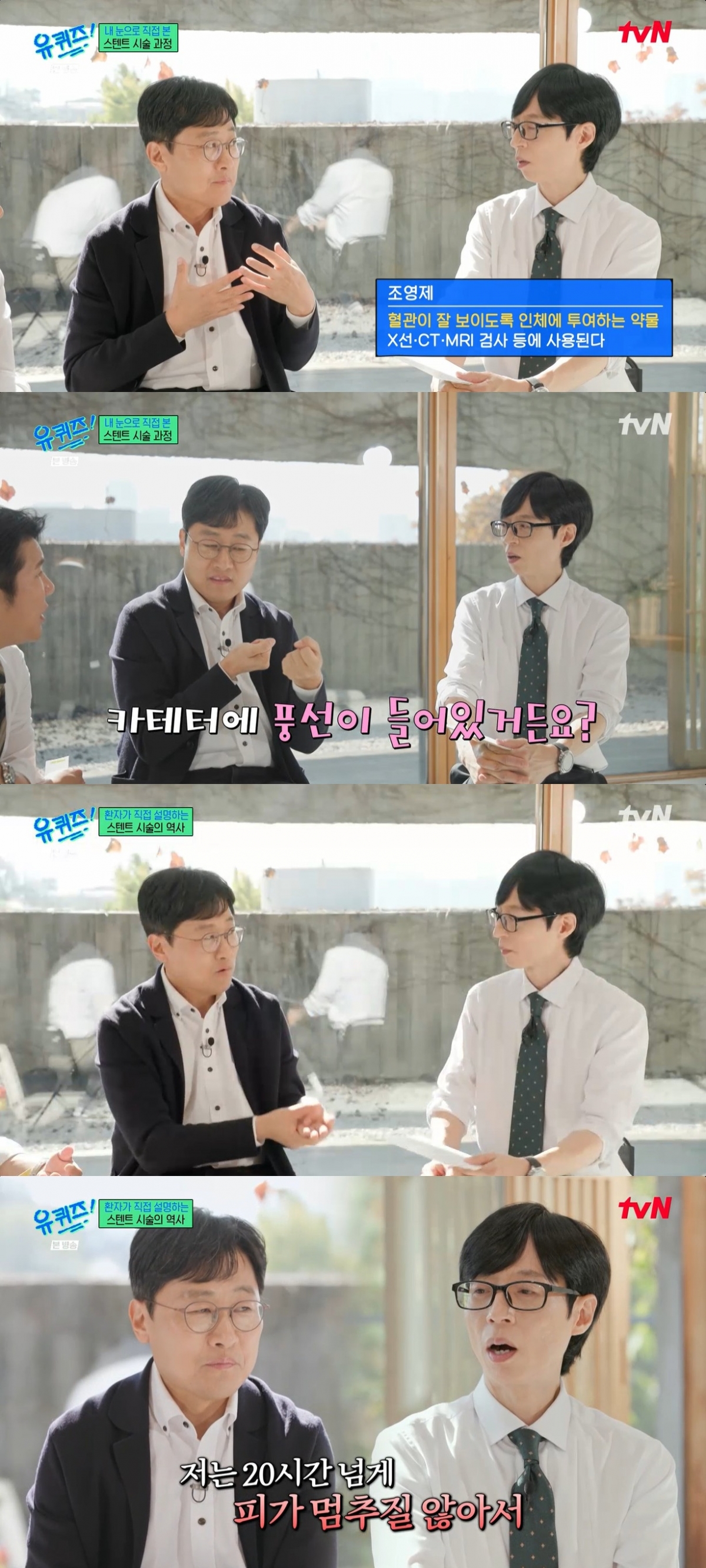 [스타뉴스|안윤지기자]/사진=tvN'유퀴즈온더블럭'방송캡처'유퀴즈'김상욱교수가심혈관시술을받았다고밝혔다.19일방송된tvN'유퀴즈온더블럭'(이하'유퀴즈')에서는김상욱교수가출연했다.김상욱교수는지난10월심근경색직전의증상이나타나심혈관스텐트시술을받았다.유재석은"건강해서다행이다"라고하니,김상욱교수는"죽지않고살았다"라고인사했다.그는"전조증상이돌이켜보니올해8월부터있었다.속이거북하고소화가안되는느낌이었다.9월부터등산하거나뛰면명치부분이답답하고땡기더라.경험하지못한답답함이었다.증상이잠깐이었다.찾아보니이게협심증증세랑비슷하더라"며"큰병원은예약하려면시간이오래걸린다.한달반을예약하고기다렸다.추석때몸도안좋았는데오후11시쯤에더심하게안좋아지고아무것도안했는데아프더라"고털어놨다.이어"보통운동하거나그래야하는데갑자기그랬다.아내가바로병원에가자고했다.응급실에갔더니당장입원하고새벽에수술하라고했다.오자마자응급상황이란게말이되나"라고전했다.또한"부분마취라서내혈관이보였다.혈관안으로튜브를집어넣는다.막힌곳은심장이고집어넣는건허벅지다.카테터를심장까지넣는다"라며"중한자실은스마트폰도안된다.혈관이막히지않도록약을먹는다.몸에서이물질을감지해서스텐트가혈관을막을수있다.난20시간넘게피가멈추지도않고한자세로가만히있어야했다.아무것도없이천장만보면서있어야한다.그래서내수술이어떤수술인지너무궁금했다"라고말했다.한편'유퀴즈'는매주수요일오후8시45분에방송된다.안윤지기자[email protected]©스타뉴스&starnewskorea.com,무단전재및재배포금지