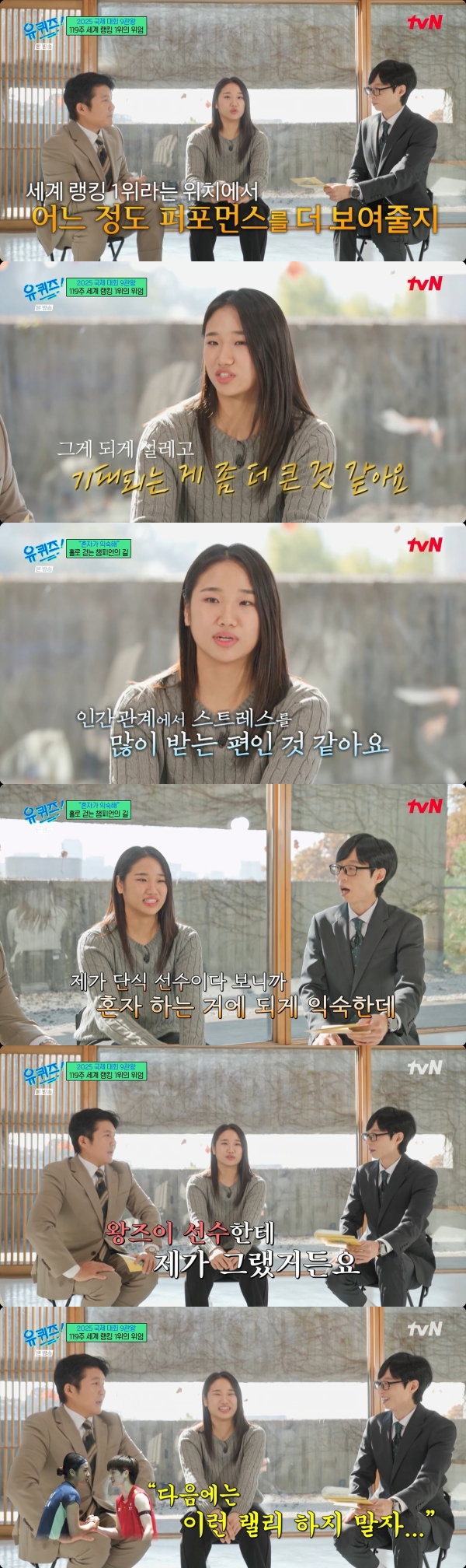 방송시청후작성된리뷰기사입니다.[OSEN=박근희기자]'유퀴즈온더블럭’안세영이방송에출연해10억원을돌파한누적상금규모와함께주변사람들에게베푸는통큰인심을공개했다.19일전파를탄tvN‘유퀴즈온더블럭’에는배드민턴여자단식세계랭킹1위안세영선수가출연했다.이날안세영은근황에대한질문에"유럽투어를갔다오고지금잠깐쉬는타임"이라고답하며바쁜일정을전했다.그는"시합이한달에두번씩은계속있다"고덧붙여,세계랭킹1위의자리를지키기위해고강도훈련과경기를끊임없이소화하고있음을짐작게했다.안세영은올시즌출전하는대회마다우승하며무려94%에달하는경이로운승률을기록하고있다.이처럼압도적인성적으로세계1위를유지하는비결로그는'동기부여'와'여유'를꼽았다.그는"세계랭킹1위라는위치가동기부여가생겨서좀잘하게되는것같다"고밝혔다.또한,"나이를먹어가면서스스로여유를가질수있게된것같다"며,심리적인변화를언급했다.안세영은"세계랭킹1위라는위치에서어느정도퍼포먼스를보여줄지설레고기대되는게좀더큰것같다"고말하며,부담감대신정점에서기량을펼치는것에대한기대감을드러냈다.한편,누적상금이10억원을돌파한사실이알려지자유재석은안세영이주변에시원시원하게잘베푸는점을언급했다.이에안세영은"언니들이한번씩밥먹을때'돈잘버니까네가쏴'라고하면흔쾌히쏠때도있다"고말해쿨한모습을보였다.더불어"은사님들께도선물많이하고,후배들한테간식도사가고그럴때도있다"고밝히며,코트안팎으로'월드클래스'의품격을보여주었다./[email protected][사진]‘유퀴즈온더블럭'방송화면캡쳐Copyright©OSEN.무단전재및재배포금지.