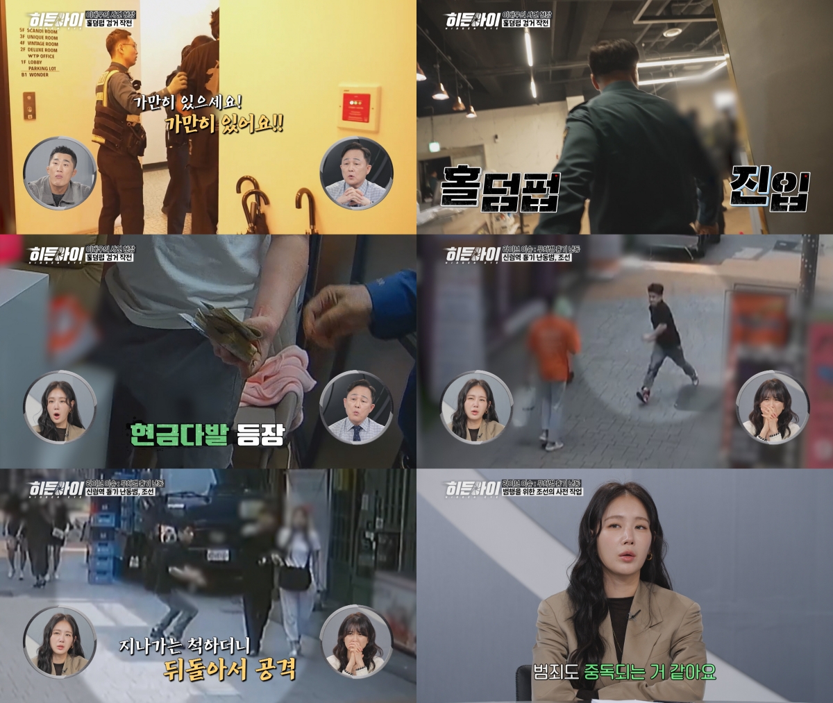 '히든아이'라이브이슈에서는최근잇따른흉기난동사건이발생하며사회적불안이커지고있는가운데,대한민국을공포로몰아넣은무차별흉기난동사건들을집중조명한다.iMBC연예뉴스사진11월17일월요일오후8시30분에방송되는범죄분석코멘터리프로그램‘히든아이’에서는MC김성주를비롯해김동현,박하선과소유가누구나겪을수있는생활밀착형범죄에대해알아본다.밤낮없이현장을누비는지구대경찰들의치열한순간을담은‘이대우의사건현장’에서는경기남부에서가장바쁜지구대중한곳인수원인계지구대의24시를함께한다.늦은밤,인계지구대경찰들은도박·마약의심신고를받고홀덤펍으로출동했다.하지만홀덤펍내부는이미불법도박과마약의흔적을찾아볼수없을만큼깨끗이정리된뒤였다.무언가를감추는홀덤펍직원의몸을수색하자어마어마한양의현금다발이줄줄이나오기시작했고,이를본김동현은“이게말이돼?!”라며놀라움을감추지못했다.거액의현금이발견된의심스러운상황에서도끝까지불법이아니라고버티는직원과함께,가게내부은밀한공간에잠겨있는문까지발견되며불법홀덤펍에대한의심은커졌는데.과연이홀덤펍에는어떤비밀이감춰져있을지그날의생생한사건현장이공개된다.라이브이슈에서는최근잇따른흉기난동사건이발생하며사회적불안이커지고있는가운데,대한민국을공포로몰아넣은무차별흉기난동사건들을집중조명한다.서울번화가한복판에서벌어진‘신림동흉기난동’의범인조선은단2분여만에20~30대또래남성들에게만칼을휘둘렀고순식간에4명의사상자를내며충격을안겼다.이후조선은손이피범벅된채거리를배회하다자신을체포하러다가온경찰을향해범행을합리화하려는듯한망언을내뱉기도했다.이망언에프로파일러표창원은‘내가행복해질방법이없으니나와비슷한사람들을불행하게만들자’는마음으로범행했을것이라며조선의왜곡된심리를날카롭게분석했다.더놀라운사실은조선이학창시절소년부에송치된이력만무려14회에달했고,성인이된뒤에도보험사기와폭행등범죄를이어온전력이있었다는것.이에소유는“범죄도중독되는것같다”라며고개를내저었다.평화로운거리를순식간에아수라장으로만든신림동흉기난동사건의내막은11월17일월요일오후8시30분,MBC에브리원‘히든아이’에서확인할수있다.iMBC연예유정민|사진출처MBC에브리원Copyright©MBC연예.무단전재및재배포,AI학습금지.