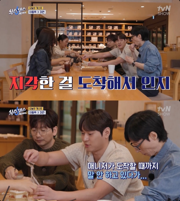사진=tvN[스포츠투데이김태형기자]녹화현장에지각한고경표가자신은지각한줄몰랐다며"매니저가도착할때까지말을안했다"고해명했다.13일방송된tvN'식스센스:시티투어2'에는대학가에숨은가짜를찾아나선가운데,이동휘와그룹아이들미연이게스트로출연했다.이날고경표가지각을했다.헐레벌떡달려와인사하는고경표에게지석진은"괜찮아.늦잠잘수있어"라고말했고,고경표는"이렇게몰아가시는건가"라며당황했다.고경표는미연에게"미연씨오랜만이에요"라며밝게인사했다.유재석은"소개팅이야?"라며장난을쳤고,고경표는"예전에예능에서만난사이"라고밝혔다.지석진은고경표에게"이거갖고가서음료시켜"라고했고,유재석은"형이계산도같이해줘"라며웃었다.미연은지석진의패션을보며"되게힙하게입으셨다"고칭찬했다.유재석은"형은힙하고싶어한다.젊다고하면X도먹는다.그정도로형이젊음에포커싱돼있다"고말해웃음을안겼다.지석진은빵터진고경표에게"경표야,늦었으면웃지마"라고잡도리를시전해또한번웃음을자아냈다.사진=tvN미미와미연은SBS'런닝맨'에서만났다고밝혔다.지석진은미연이두번째솔로앨범으로돌아왔다는말에"미연이아이들에서메보(메인보컬)야"라며"메보처럼안생겼지?"라고물었다.그러더니나락을감지하고곧바로"전국의메보들죄송합니다.다른의도가있어서가아니라"라고사과했다.고경표는지각을하게된것에대해"저는제가지각했다는걸도착해서야알았다"며"매니저가여기도착할때까지말을안하고있었다"고밝혔다.이에유재석은"매니저도여러가지를생각한거다.나도마음이급한데경표까지급할필요가없고,오는길에나까지욕먹을필요는없어서그런거다.매니저가현명한것"이라고말해웃음을자아냈다.이동휘또한"부모님의마음인것같다.아프더라도부모님은말씀을안하시지않냐.그런데유행이되면안될것같다"고덧붙였다.[스포츠투데이김태형기자[email protected]]Copyright©스포츠투데이.무단전재및재배포금지.