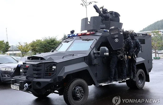 경찰,최고수준비상근무'갑호비상'…CEO서밋행사장에특공대상시대기보문단지·공항·경주역긴장감…주요인사속속도착,정점이른경계태세장갑차타고출동하는경찰특공대(경주=연합뉴스)손대성기자=아시아태평양경제협력체(APEC)정상회의를앞두고20일경북경주화백컨벤션센터에서경북경찰청소속경찰특공대가대테러훈련을하고있다[email protected](경주=연합뉴스)특별취재단=도널드트럼프미국대통령의방한을하루앞둔28일아시아태평양경제협력체(APEC)정상회의개최지인경북경주시일대는삼엄한경계태세속에긴장감이고조됐다.트럼프대통령등각국정상의도착이예고되며보문관광단지를비롯해경북도전역은경찰비상근무최고단계인'갑호비상'이내려지며정점에이른경계태세가가동됐다.CEO서밋행사장에투입된경찰특공견'탐'(경주=연합뉴스)김선형기자=28일오전경북경주시예술의전당에서최고경영자(CEO)서밋안전유지를위해투입된경북경찰청특공대소속탐지견과특공대원이행사장입구앞에서있다[email protected]최고경영자(CEO)서밋행사가열리는경주예술의전당에는이날오전8시30분부터경찰특공대와폭발물탐지견들이안전검측과위력순찰을위해투입됐다.주차장에서부터레드카펫이설치된건물앞까지경북경찰청특공대소속탐지견'탐'과'찰리'는연신주위를경계하며이동했다.긴장감이감도는행사장일대를두마리탐지견은특공대원의지휘에따라차례로살피며폭발물이나위험물흔적이없는지꼼꼼히점검했다.관문인KTX경주역에서도매일오전과오후각기두차례씩경찰특공대가위험요인점검을위해일대를순찰했다.APEC정상회의장이있는보문관광단지내일대인도와차로사이에는진입을막는울타리와차단선이줄줄이설치됐다.경찰순찰차등은수시로정상회의장주변을돌며행사장외곽을촘촘히통제했다.대도시와달리차로가넓지않은경주의지리적특성상신속한대응을위해경찰오토바이와순찰차가외교차량을밀착에스코트하며이동동선마다경호에나서게된다.보문관광단지일부도로는보안상이유로차량진입이제한됐으며,곳곳에서우회가권고됐다.경찰은각국정상의일정과이동동선에맞춰단계별차단선을설치해회의장과숙소,행사장을잇는전구간을통제하고있다.APEC정상회의앞두고보안검문대설치(경주=연합뉴스)이동해기자=2025경주아시아태평양경제협력체(APEC)정상회의주간개막을하루앞둔지난26일경북경주보문단지내경주화백컨벤션센터(HICO)에서관계자들이보안검문대를설치하고있다[email protected]정상회의장인경주화백컨벤션센터(HICO)입구에는보안검문대가들어섰다.평소공항출국장에서나마주할수있는보안검문대가작동하자행사장주변은한층더엄중한분위기가감돌았다.경찰은전날까지행사장일대에'을호비상'경비체계를가동했다가,이날오전0시부터경북도내전체에가장높은수준의비상근무단계인'갑호비상'을발령했다.갑호비상중에는경찰관의휴가가중지되며가용경력을100%까지동원할수있다.경찰지휘체계는본부와현장상주형태로운영되어,24시간대응태세를유지할수있다.경주에는APEC기간하루최대1만9천명규모의경력이동원돼경주전역을봉쇄한다.회의장주변상공은비행금지구역으로설정됐으며,드론위협에대비해드론무력화·격추장비가배치됐다.경찰기동대와특공대,헬기,육군장갑차도정상숙소와회의장주변에배치돼외부인출입을철저히통제하고있다.펜스세워진APEC정상회의장(경주=연합뉴스)윤관식기자=2025아시아태평양경제협력체(APEC)정상회의주간을하루앞둔지난26일경북경주시화백컨벤션센터APEC정상회의장앞에펜스가설치된가운데관계자차량이이동하고있다[email protected]황리단길과대릉원등관광객이모이는주요명소는특별치안강화구역으로지정돼범죄예방활동이전개됐다.특별치안강화구역에동원된경찰관은모두경주지리와환경을잘알고있는지역경찰이다.범죄예방진단팀(7명)·특별순찰팀(3개팀25명)·형사(4개팀21명)·여성청소년범죄전담팀(3개팀9명)으로편성됐다.특히시민단체등의집회가예정된경주역과황리단길일대에는비상상황발생시경력이즉시투입될수있도록대응태세가유지되고있다.소방당국도24시간비상체계를가동해화재와안전사고예방활동을벌이고있다.오부명경북경찰청장은"테러나안전사고가발생하면모든준비가무의미해질수있는만큼총력대응체계를가동중"이라며"단한건의돌발상황도허용하지않겠다는각오로대응하고있다"고말했다.APEC준비총력전,펜스설치하는관계자들(경주=연합뉴스)이동해기자=2025경주아시아태평양경제협력체(APEC)정상회의주간개막을하루앞둔지난26일경북경주보문단지내경주화백컨벤션센터(HICO)인근에서관계자들이펜스를설치하고있다[email protected](김선형기자)[email protected]▶제보는카톡okjeboCopyright©연합뉴스.무단전재-재배포,AI학습및활용금지