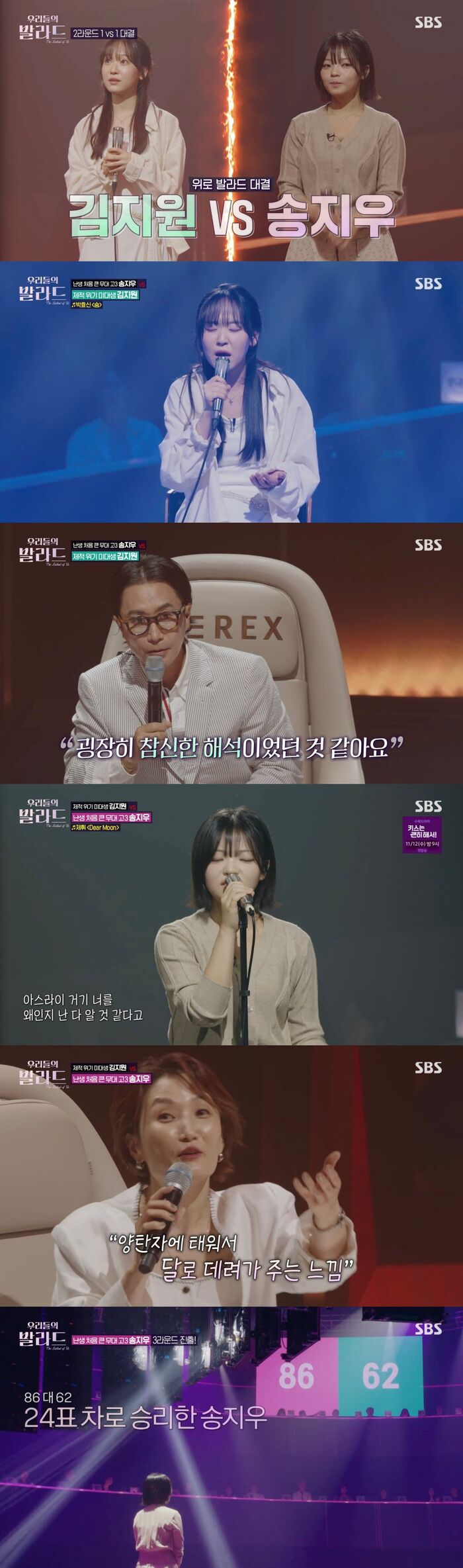 [SBS연예뉴스|김효정에디터]송지우가다음라운드에진출했다.28일방송된SBS'우리들의발라드'에서는김지원과송지우가맞붙었다.이날방송에서김지원은박효신의숨을선곡했다.그는숨쉴곳없는힘든곡을선택한이유에대해"위로라는주제를고르게되고어떤곡을하는게좋을까고민을하다가내게위로가되었던이노래를선택하게됐다"라고밝혔다.경연당일까지목소리가제대로나지않아힘들어하던김지원은자신만의스타일대로곡을소화했다.이에정재형은"이노래가어울릴까생각했던걸기분좋게깨부쉈다.그리고독특하다.이바이브레이션과이음색으로발라드를부른다면되게좋을거같다.타고난소리가너무좋다"라고칭찬했다.하지만전체적으로조금급했다며아쉬움을드러냈다.이에대니구는"난이곡이그렇게잘어울렸다고생각을안한다.지난경연때목소리를듣고브릿팝을하면어떨까하고계속생각이들었다.떨림과음색이되게시원한소리를낼수있는데그런곡을불렀으면어떨까하는아쉬움이있다"라고말했다.송지우는드라마'나의아저씨'OSTDearMoon을선곡했다.그는"학원에서끝나고집에돌아갈때위로의곡들을많이듣는데그때많이듣던곡이다"라며소개했다.몽환적인분위기로노래하던송지우의무대가끝나자어느누구도선뜻입을떼지못했다.전현무는"달빛만받고가는것만으로도위로가된다고했는데지우씨의음색만으로도위로를받는구나생각이들었다"라고감탄했다.그리고대니구는"도입부를되게덤덤하게부르는데소리에서빛이났다.그게너무좋았다"라고극찬했다.이어정재형은"영화음악같았다.미셸공드리의영화'수면의과학'이라는영화도떠오르고유럽의작은영화를본기분이다.목소리를듣는데상상력을자극해서나도이런곡을써볼까하는생각이들었다"라며"나만의판타지를만들수있는서사능력이있는거같다"라고평가했다.그리고박경림은"양탄자에태워서달로데려가주는느낌이었다.몽환적이고신비하고매력적이었다"라고감탄했다.탑백귀의투표결과는86대62로송지우가승리하며다음라운드에진출했다.Copyright©CopyrightⓒSBS.Allrightsreserved.무단전재,재배포및AI학습이용금지