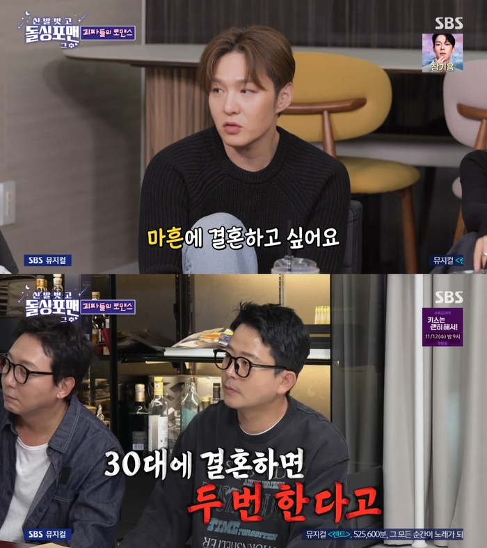 ‘신발벗고돌싱포맨’.사진ISBS‘신발벗고돌싱포맨’방송캡처가수이창섭이결혼계획을전했다.28일방송된SBS‘신발벗고돌싱포맨’에는최다니엘,KCM,이창섭,솔라가게스트로출연했다.이날이창섭은“결혼생각이있냐”는질문에“마흔에결혼하고싶다”고해눈길을끌었다.이창섭은특별히40세에결혼하고싶은이유에대해“일을계속하고싶은것도있고부모님이점을보러갔는데30대에결혼시키지말라고하더라.30대에결혼하면2번한다고”라고이야기했다.재혼한김준호가“왜그러냐.(결혼2번하는게)어때서그러냐”고발끈하자탁재훈은“혹시이창섭어머니가김준호의점을봐준거냐”고너스레를떨어웃음을자아냈다.한편‘신발벗고돌싱포맨’은매주화요일오후11시방송된다.[이세빈스타투데이객원기자]Copyright©스타투데이.무단전재,재배포및AI학습이용금지