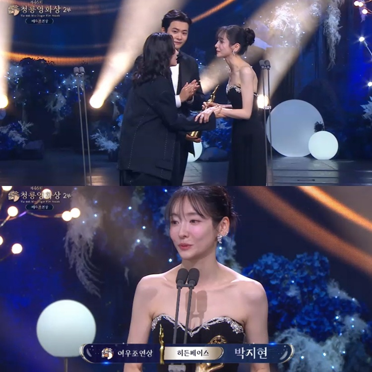 제46회청룡영화상시상식이19일여의도KBS홀에서열렸다.여우조연상을수상한박지현이수상소감을말하고있다.허상욱기자[email protected]/2025.11.19/제46회청룡영화상시상식이19일여의도KBS홀에서열렸다.여우조연상을수상한박지현이수상소감을말하고있다.허상욱기자[email protected]/2025.11.19/[스포츠조선조민정기자]배우박지현이제46회청룡영화상여우조연상을수상했다.박지현은'히든페이스'에서미묘한감정선을현실감있게표현하며극의긴장감을끌어올렸다는평가를받았다.차갑고단단한내면을가진캐릭터를섬세한표정과대사톤으로설득력있게완성하며관객과평단모두에게강렬한존재감을남겼다.올해여우조연상부문에는는엔'얼굴'신현빈,'어쩔수가없다'염혜란,'좀비딸'이정은,'검은수녀들'전여빈,그리고'히든페이스'박지현까지쟁쟁한후보들이경쟁을벌인가운데박지현이트로피를거머쥐게됐다.수상소감을밝힌박지현은"상을받게될줄몰랐다.'히든페이스'미주캐릭터를맡겨주신감독님과함께연기해주신조여정,송승헌선배감사드린다.'곤지암'영화로신인상후보로청룡영화상을찾았는데그때는배우선배님들,감독님들구경하기바빴다.지금은제가응원하는분들도계시고,제가이곳에함께있는것만으로도기뻤다.그런데이렇게상까지받게되어서정말축제의장인것같습니다.상을직접받게되니욕심생긴다.상더많이탈수있도록노력하겠다.소속사대표님이하식구들,매니저들도감사드린다.TV보고있을가족들그간너무감사드리고사랑한다고전하고싶다.앞으로더열심히하겠다"고말했다.한편올해로46회를맞이한청룡영화상은대한민국영화인과팬들이한데어우러져지난1년간의한국영화성과를축하하는대한민국최고권위의시상식이다.조민정기자[email protected]©스포츠조선.무단전재및재배포금지.
