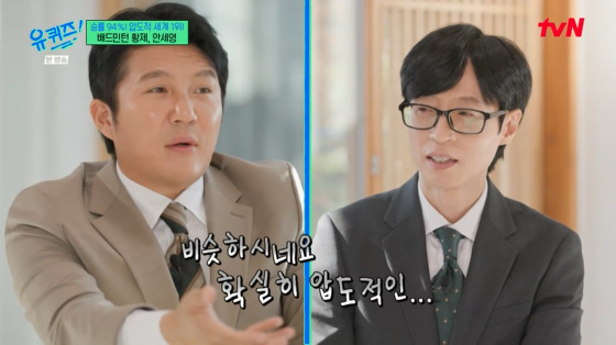 유퀴즈화면캡처각자의분야에서압도적1위인유재석과안세영의공통점이발견됐다.19일방송된tvN‘유퀴즈온더블럭’에는세계랭킹1위배드민턴황제안세영이함께했다.이날누적상금10억이됐다는안세영은주변에선물도많이한다며“언니들이한번씩밥먹을때너가돈많이버니까쏘라고하면흔쾌히사고,은사님들께선물많이하고,후배들한테간식도많이사간다”고밝혔다.유재석은“나를위해서산것은없냐”고물었고,안세영은“특별히쓰지는않는다.최근에지갑을바꿨다.저는동생을꾸미는맛이있어서동생을머리부터발끝까지꾸며줬다”며“저한테쓰는것보다다른사람한테쓰는게더기분이좋다”고밝혔다.이를듣던조세호는“비슷하다.확실히압도적인1위들은.또브랜드평판1위거든요”이라며유재석을가리켰고,유재석은손사레를쳤지만“딱히본인한테소비하는게없잖아요”라고물었다.안세영은조세호에게“뭐사셨어요?”라고물었고,조세호는“최근에자켓하나샀다”고고백했다.유퀴즈화면캡처유퀴즈화면캡처이소진기자[email protected]©스포츠경향.무단전재및재배포금지.