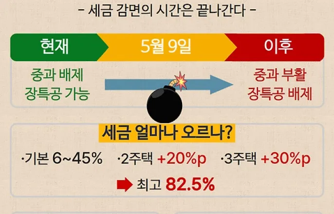 다주택자들에게주어진‘세금감면의시간’이카운트다운에들어갔습니다.다주택자양도소득세중과한시배제조치가오는5월9일종료를앞두면서(현행기준),부동산시장의셈법이다시복잡해지고있습니다.유예기간이끝나는5월10일부터는조정대상지역내다주택자에게징벌적수준의‘중과체계’가되살아납니다.기본세율(6~45%)에2주택자는20%포인트,3주택이상보유자는30%포인트의가산세율이더해집니다.지방소득세까지포함하면최고세율은82.5%에육박합니다.여기에‘장기보유특별공제(장특공)’혜택마저사라집니다.사실상자산증식의‘마지막비상구’가닫히기전,시장의움직임과팩트에기반한대응전략을짚어봤습니다.◇"5월지나면세금폭탄"…무엇이달라지나서울남산전망대에서바라본아파트단지.(연합뉴스)핵심은‘세율인상’과‘공제배제’입니다.현재중과한시배제기간에는다주택자라도요건을갖추면기본세율을적용받고,보유기간에따라장기보유특별공제(최대30%,보유기간등요건충족시)혜택도받을수있습니다.하지만한시배제가끝나면상황은급변합니다.중과세율이적용됨과동시에,세금을크게줄여주던장특공적용이전면배제됩니다.똑같은집을팔더라도5월9일이전과이후의세금고지서가확연히달라지는이유입니다.다만,실제납부할세액은개별주택의보유기간,필요경비,기본공제,그리고주택수판정(분양권·입주권포함여부)등에따라편차가큽니다.따라서단순한수치대입보다는,‘중과적용시세부담이급증할수있다’는전제하에세무전문가와상담하는것이필수적입니다.◇D-100,"지금"계산기두드려야할이유서울시내의부동산에붙은매매안내문.(연합뉴스)원칙적으로양도세의기준이되는‘양도시기’는잔금청산일과소유권이전등기접수일중빠른날입니다.통상적인거래관행을고려하면지금매도결정을내려야빠듯하게기한을맞출수있습니다.하지만무조건‘2월이마지노선’이라고단정짓기는이릅니다.정부가최근5월9일까지‘매매계약을체결한건’에한해,잔금납부와등기를3~6개월가량유예해주는보완책(경과규정)을추진하고있기때문입니다.따라서다주택자들은막연한공포심에휩쓸리기보다①5월9일이전계약체결가능성②정부의잔금유예경과규정확정여부③보유주택의조정대상지역해당여부를종합적으로고려해타임라인을짜야합니다.◇'똘똘한한채'전략vs증여…복잡해진셈법(출처=구글제미나이생성AI이미지)시장의대응은크게두갈래로나뉩니다.첫째,‘못난이매물’정리입니다.시세차익이적거나수요가약한외곽주택부터처분해주택수를줄이고,핵심지의‘똘똘한한채’를남기는전략입니다.이경우일시적2주택비과세특례등을활용할수있는지개별요건을꼼꼼히따져봐야합니다.둘째,부담부증여입니다.급매로도처분이어렵거나장기보유가치가높은매물이라면자녀에게증여하는방식을택하기도합니다.다만취득세율을주의해야합니다.모든증여가12%인것은아니지만,조정대상지역내일정가액이상의주택을다주택자가증여할경우12%의중과세율이적용될수있습니다.또한전세를낀부담부증여의경우,승계되는보증금(채무)부분은유상양도로간주되어양도세가발생하므로득실계산이필수적입니다.◇"더이상의유예는없다"…정부시그널은'정상화'이재명대통령이29일청와대에서열린수석보좌관회의에서발언하고있다.(연합뉴스)일각에서는선거등을의식해중과배제가연장될것이란기대섞인관측도내놓습니다.하지만정부의공식적인정책신호는‘종료(정상화)’쪽에무게가실려있습니다.정부는지난2월초“다주택자양도세중과유예를예정대로5월9일에종료한다”는방침을재확인했습니다.대신계약분에대한경과조치를두어시장충격을완화하겠다는입장입니다.즉,정책방향은‘무기한연장’보다는‘제도정상화와제한적구제’로굳어지는모양새입니다.막연한기대감으로버티기엔리스크가커진셈입니다.이제남은시간은약100일.중과세체계의복귀를상수로놓고,‘팔것인가,증여할것인가,아니면세금을감수하고버틸것인가’를내상황(보유기간,대출구조등)에맞춰시뮬레이션해야할때입니다.