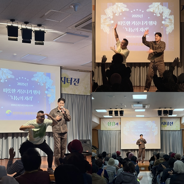 거리의시인노현태와트롯황소김경민이18일,서울양천어르신복지관에서어르신들을위한‘건강박수’재능기부공연을펼치며따뜻한감동을전했다.이날현장에는약100여명의어르신들이함께하며유쾌하고뜻깊은시간을나눴다.행사의문을연노현태는특유의재치있는입담과레크리에이션으로어르신들의마음을활짝열었고,이어무대에오른김경민은힘있는가창력과신곡대전역골목등다양한무대매너로분위기를끌어올렸다.두사람은음악과웃음,그리고건강메시지를전하며어르신들과깊은공감대를형성했다.공연을마친두출연자는“어르신들의웃음속에서이활동이단순한이벤트를넘어삶의에너지가될수있다는확신을얻었다”며“앞으로도더많은복지기관을찾아건강과행복을나누는재능기부를이어가겠다”고전했다.다원문화복지재단의정보석명예이사장은“진정성있는문화프로그램이어르신들에게큰활력소가되고있다”며“앞으로도지역사회와함께어르신들의삶의질향상을위한다양한프로그램을확대해나가겠다”고말했다.한편노현태와김경민은현재‘건강박수프로젝트’를통해전국의노인복지기관방문,건강문화캠페인,공연활동등을활발히전개하고있으며,매주월요일오전11시SBS'보석이네건강수다'의고정패널로출연하며건강한노후를위한메시지를전하고있다.bnt뉴스연예팀기사제보[email protected]©bnt뉴스.무단전재,재배포및AI데이터활용금지