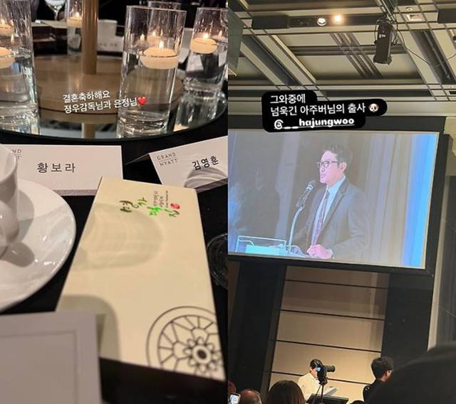 배우함은정과김병우감독의결혼식현장이공개됐다.황보라SNS배우함은정과김병우감독의결혼식현장이공개됐다.특히배우하정우가축사를맡아유쾌한분위기를조성했다는소식이전해지며팬들의눈길을끌었다.30일황보라는자신의SNS를통해함은정과김병우감독의결혼식현장을담은사진들을공개했다.남편인김영훈씨와함께참석한황보라는"결혼축하해요.병우감독님과은정님"이라면서"그와중에너무웃긴아주버님의축사"라며화면에비친하정우의모습을공개했다.하정우는김병우감독과'더테러라이브''PMC:더벙커'에서감독과배우로만나호흡한바있다.이날함은정과김병우감독은서울에위치한한호텔에서결혼식을올렸다.두사람은영화계지인모임에서만나연인으로발전했고열애설없이지난달16일결혼을발표했다.이와관련,함은정은"평생제곁을지켜줄것같던엄마를1년전떠나보내고나니엄마처럼밝고따뜻한제가정을이루고싶은마음이들었다"라면서"제일을누구보다잘이해하고존중해주고,또힘들때제곁을묵묵히든든하게지켜준분과새로운출발을함께하기로했다"고결혼소식을전해축하인사를받았다.함은정과김감독은신혼여행을미루고본업에집중한다.함은정은내달첫방송되는MBC'첫번째여자'촬영에임하고있으며김감독역시넷플릭스오리지널영화'대홍수'공개를앞두고있다.우다빈기자[email protected]©한국일보.무단전재및재배포금지.