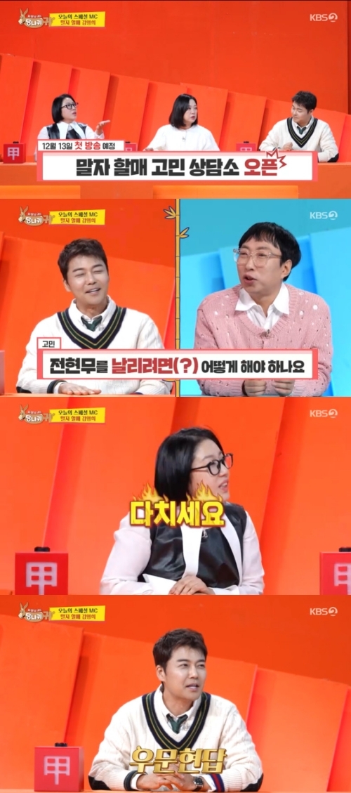 ‘사당귀’.사진lKBS박명수가검은속내를드러냈다.30일오후방송된KBS2예능프로그램‘사장님귀는당나귀귀’(이하‘사당귀’)에는코미디언김영희가일일패널로출연했다.이날방송에서김영희는본인의캐릭터‘말자할매’가KBS단독예능편성이확정됐다고했다.김영희가고민을들어주겠다고하자박명수는“제가‘사당귀’3년째인데MC로올라가야하는데한명이안나간다”며전현무가나가기만을기다리고있다고했다.이에김영희는“누구를날려서그자리에앉다가는다친다.박명수씨자리를누군가날리고싶어할수있다.그게바로나.그러니본인자리를먼저지켜라”고훈수를뒀다.박명수는“우문현답이다”라며꼬리를내렸다.‘사당귀’는매주일요일오후4시45분KBS2에서만날수있다.[서예지스타투데이객원기자]Copyright©스타투데이.무단전재,재배포및AI학습이용금지