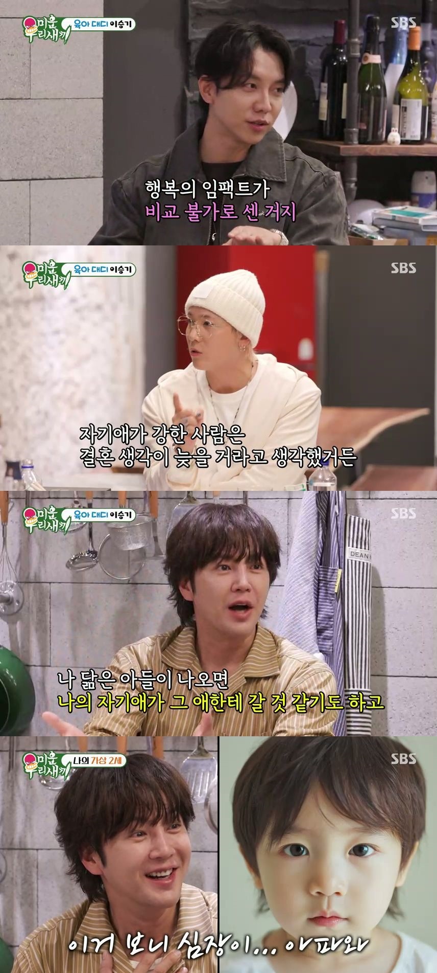 이승기가딸과함께하는현실육아이야기를전하며'딸바보'면모를숨김없이드러냈다.장근석의초대로이홍기와함께방송에출연한그는결혼후달라진삶과육아에대한소회를전해눈길을끌었다.iMBC연예뉴스사진이승기는아침부터시작되는육아루틴을소개했다.그는"일어난아이와놀아주다가기저귀갈아주고,이닦이고아침먹이고한다.그러다9시넘어서아이를등원시킨다"고설명했다.이어"육아는누가더많이,이런게아니다.서로시간이되면같이씻기고,같이본다.역할을나누기시작하면싸움난다"라며부부가동등하게참여하는방식이라고강조했다.이어"당연히힘들지.그순간을제외하고힘든게더많다.근데행복의임팩트가비교불가로센거다"고덧붙였다.딸의외모를두고도재치있는해석을내놨다.이승기는"태어났을땐나를쏙닮았다.지금도하관은나인데,웃는표정은엄마를닮았다.귀모양도엄마와똑같다"고말했다.이홍기가가상어플로구현한2세모습에대해선"이게가장근사치다.꽤비슷하다"며신기해했다.음악활동을준비중인아빠를응원하는딸의에피소드도전해졌다.그는"새노래반응을보는데,딸이스피커에대고'아빠아빠'하더라.목소리를다안다"며"틀어주면엉덩이춤을추고,열번이고계속틀어달라고한다"고말해웃음을자아냈다.소파위를뛰며신나게춤추는영상까지공개해두친구의부러움을샀다.육아의고됨을솔직하게인정하면서도그는"당연히힘든순간이많지만,행복의임팩트가워낙세서다이긴다"며미소를지었다.결혼에대해선"100프로추천한다"고말했다.이홍기가장근석에게“형도결혼하고싶어하잖아”라고묻자,장근석은“이제는누군가와함께하는삶을살고싶다.나닮은아이가태어나면그애한테내자기애가옮겨갈것같다”고답했다.한편,이승기는2023년배우이다인과결혼해슬하에딸을두고있으며,바쁜활동중에도직접등하원시키는등육아에적극적으로참여하고있다.부부와아이가함께만들어가는그의새로운라이프에팬들의응원도더욱뜨겁다.iMBC연예김경희|사진출처SBSCopyright©MBC연예.무단전재및재배포,AI학습금지.