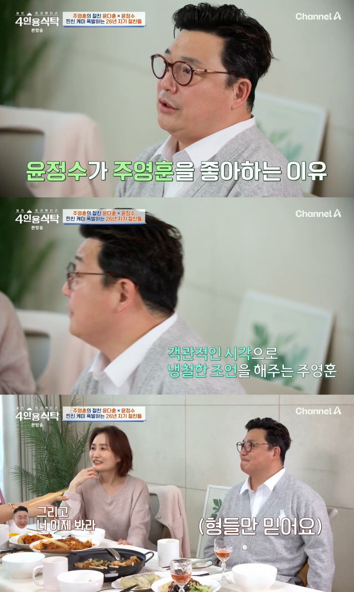 [스타뉴스|안윤지기자]/사진=채널A'절친토큐멘터리4인용식탁'방송캡처'4인용식탁'방송인윤정수가주영훈을좋아하는이유에대해밝혔다.1일방송된채널A'절친토큐멘터리4인용식탁'(이하'4인용식탁')에서는주영훈,윤정수,윤다훈이게스트로출연했다.윤정수는"(주)영훈이형은말이많지만,팩트만말한다.챗GPT같다.내가판단하기좋다.예를들어'김숙이랑사귀는거냐'라고물었다"라며"'연기한다'고하니'사람들이막좋아한다고넘어가면안되고판단잘해야한다'라고했다.모두가'김숙괜찮으니만나라'고할때(주영훈만)명확히만나는게좋다"라고말했다.이에주영훈은"내주변아내들이아이들교육에있어서엄마들이나랑상담한다"라며"AI가나와도감성적인건안된다"라고자신만만해했다.한편'4인용식탁'은매주월요일오후8시10분에방송된다.안윤지기자[email protected]©스타뉴스&starnewskorea.com,무단전재및재배포금지