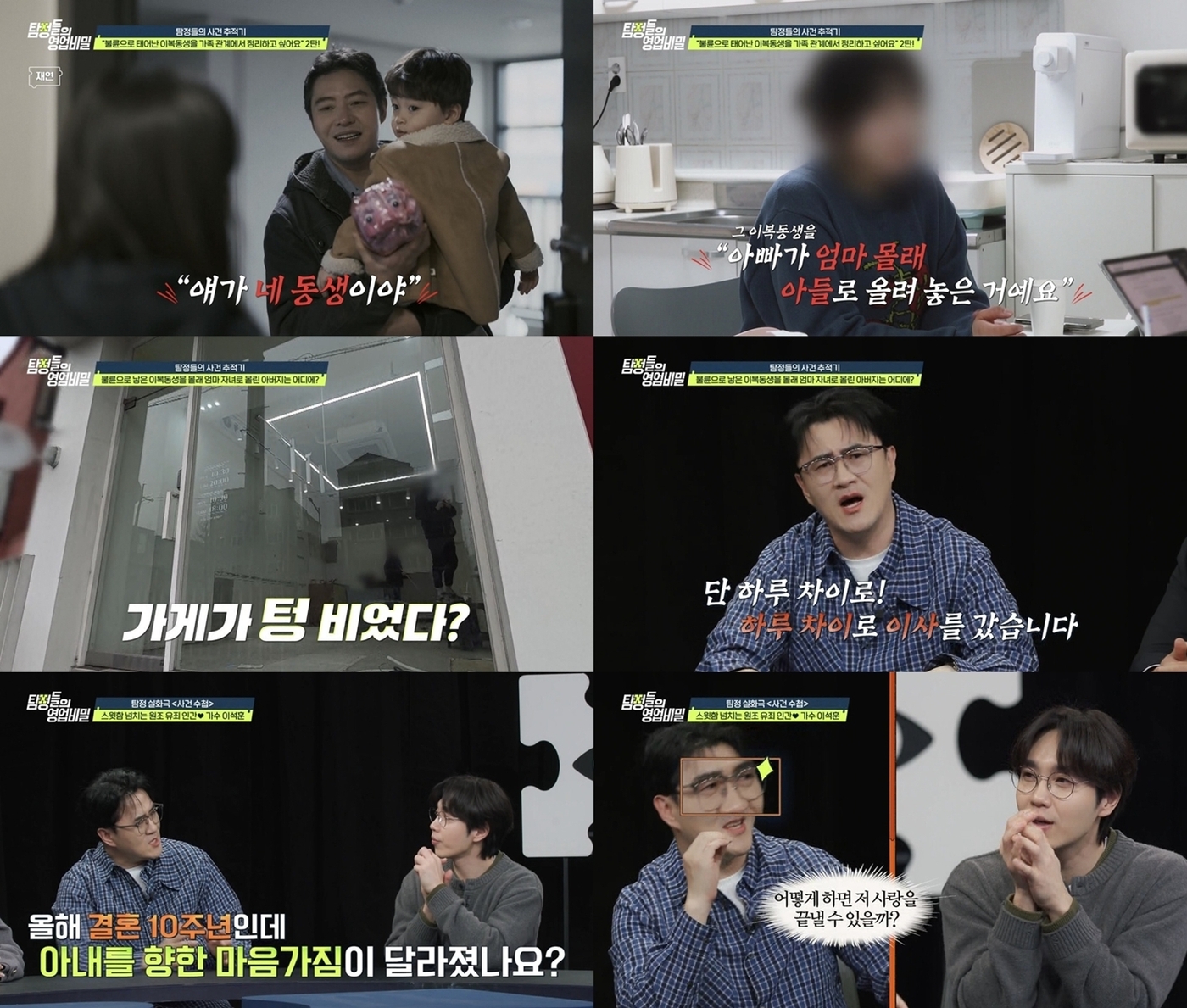 채널A'탐정들의영업비밀'탐정들의영업비밀(서울=뉴스1)황미현기자=채널A'탐정들의영업비밀'이역대급불륜사연과숨막히는추적극으로안방극장을찾는다.오는30일밤10시방송되는'탐정들의영업비밀'속코너'탐정24시'에서는외도로낳은아이를이혼한전처의친자로호적에올린비정한아버지의사연이공개된다.의뢰인은"아버지가과거미용실직원과외도를저질러낳은이복동생을어머니몰래친자로등록했다"며잘못된가족관계를바로잡고싶다는간절한도움을요청했다.실제가족관계증명서확인결과,의뢰인아버지가이혼전낳은혼외자가전처의자녀로등재되어있어충격을안겼다.사연을접한데프콘은"기가막힌사연"이라며말을잇지못했고,탐정단은본격적인추적에나섰다.하지만추적과정은순탄치않았다.탐정단이의뢰인아버지의주소지를찾아갔으나,"어제이사갔다"는이웃의증언과마주하며단하루차이로행방을놓치는초유의사태가벌어졌다.집과미용실모두최근에옮긴사실이드러나며수사는다시원점으로돌아갔고,탐정단은"천당과지옥을오가는기분"이라며초조함을드러내결말에대한궁금증을더했다.한편이날방송에는가수이석훈이일일탐정으로출연해활력을불어넣는다.올해로결혼10주년을맞이한'원조유죄인간'이석훈은변심을묻는미혼자데프콘의질문에"미혼자들은'어떻게하면저사랑을끝낼수있을까'하는눈빛을보낸다"며재치있게받아쳐현장을웃음바다로만들었다.사랑꾼다운면모와반전입담을뽐낸이석훈의활약과충격적인불륜추적극의전말은30일월요일밤10시채널에이'탐정들의영업비밀'에서확인할수있다[email protected]©뉴스1.Allrightsreserved.무단전재및재배포,AI학습이용금지.