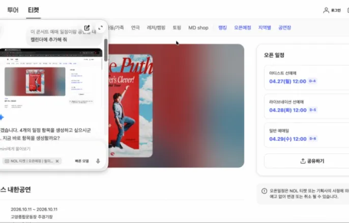 맥OS용제미나이사용기단축키통해제미나이곧바로호출화면내용실시간공유가능"화면에보이는콘서트일정을구글캘린더에등록해줘."해외가수의내한콘서트티켓팅을앞두고맥북으로예매안내페이지를보던중옵션(option)키와스페이스바를함께누르자제미나이앱의입력창이나왔다.창공유기능을켠뒤제미나이에게이렇게요청하자'4개의일정을생성할까요?'라는답이돌아왔다.화면에나온3차례의예매일정과공연일까지정확히인식한뒤이용자의확인을받은것이다.일정을추가해달라고요청하자예매와공연일정이곧바로구글캘린더에추가됐다.맥OS용제미나이앱을통해화면의내용을공유할수있다.캡처구글이이달애플의PC용운영체제(OS)인맥OS(macOS)에서쓸수있는제미나이앱을내놨다.제미나이앱이스마트폰이외에PC용으로출시된건이번이처음이다.이용자는다른작업을하다가도옵션키와스페이스바를함께누르면곧바로제미나이를호출해대화할수있다.맥OS상단의메뉴바에서제미나이바로가기버튼을누르거나앱모음에서제미나이를실행하는방식으로도이용할수있다.기존에는웹브라우저를통해제미나이웹페이지에별도로접속해야했다.제미나이앱버전에서는기존제미나이의모든기능을그대로활용할수있다.채팅을통해원하는정보를찾거나작업을지시하는것은물론,PC에있는이미지나문서등을첨부해작업을지시할수도있다.구글의이미지생성AI모델인나노바나나를이용해원하는이미지를생성하거나영상,음악을만드는것도그대로지원한다.맥OS용제미나이앱을통해화면의내용을공유할수있다.캡처맥OS용앱의가장큰차별점은내가보고있는화면을그대로제미나이에게공유할수있다는것이다.사파리,크롬과같은웹브라우저를비롯해사진,메신저,문서등모든앱의화면을제미나이에공유해질문할수있다.웹페이지에올라온사진이무엇인지찾아달라는요청은물론,문서화면을공유한뒤요약또는번역을해달라고할수있다.업무상황에서도엑셀수식이원하는대로실행되지않으면화면을공유해고칠점을찾을수있고,프로그램개발과정에서오류가난다면코드를공유해오류가발생하는원인을찾을수있다.이를통해AI가행동까지대신해주는에이전틱AI기능도제한적으로이용할수있다.메일이나메시지,카카오톡대화내용등을제미나이앱에공유한뒤이를기반으로구글캘린더에일정을추가할수있다.제미나이와의대화만으로원하는상대에게지메일을통해메일을보낼수도있다.다만이용자의PC를직접조작하거나웹브라우저를직접작동하는등의행동까지는할수없다.현재는구글캘린더,지메일,드라이브등구글서비스에한해서만제한적인AI에이전트기능을이용할수있다.제미나이앱은앱스토어가아닌제미나이공식홈페이지에서내려받아야하며,맥OS세쿼이아(15.0)이상의OS와애플의자체칩인애플실리콘을탑재한기기에서사용가능하다.한편,제미나이는애플이올해하반기출시할것으로예상되는차세대시리에도탑재될예정이다.애플은지난1월구글과계약을맺고차세대AI파운데이션모델을구글제미나이모델과클라우드기술을기반으로구축하기로했다.이명환기자[email protected]©아시아경제.무단전재및재배포금지.