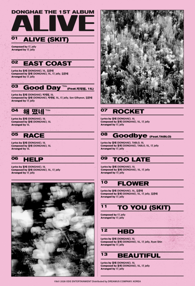 동해,정규1집에박재범·타블로피처링(제공:오드엔터테인먼트)그룹슈퍼주니어(SUPERJUNIOR)동해가웰메이드명반탄생을예고했다.동해는2일0시공식SNS채널을통해첫번째정규앨범‘ALIVE(얼라이브)’의트랙리스트를공개했다.공개된트랙리스트에따르면이번앨범에는더블타이틀곡‘GoodDay(굿데이)(Feat.박재범,1iL)’와‘해떴네’를비롯해‘ALIVE(SKIT)(얼라이브(스킷))’,‘EASTCOAST(이스트코스트)’,‘RACE(레이스)’,‘HELP(헬프)’등다양한트랙이수록된다.이외에도‘ROCKET(로켓)’,‘Goodbye(굿바이)(Feat.TABLO)’,‘TOOLATE(투레이트)’,‘FLOWER(플라워)’,‘TOYOU(SKIT)(투유(스킷))’,‘HBD(해피벌스데이)’,‘BEAUTIFUL(뷰티풀)’까지총13개의트랙을수록,다채로운장르를통해리스너들에게듣는재미를선사할예정이다.특히이번앨범에는화려한피처링라인업이지원사격에나서완성도를높였다.타이틀곡‘GoodDay’에는박재범이참여해동해와특별한음악적합을기대케했고,수록곡‘Goodbye’에는에픽하이의타블로가피처링으로이름을올려역대급음색시너지를향한기대감을최고조로끌어올렸다.이뿐만아니라동해의높은참여도역시눈길을끈다.이번신보대다수곡의작사,작곡을주도하며크레딧을꽉채운동해는싱어송라이터로서의역량을가감없이발휘할계획이다.데뷔후처음으로선보이는정규앨범인만큼,제작과정전반에참여하며자신만의짙어진음악색깔과독보적인감성을고스란히담아냈다.앞서타임테이블공개와첫솔로투어서울공연전석매진소식으로컴백열기에불을지핀동해.감각적인트랙리스트를통해‘올라운더아티스트’의면모를다시한번예고한그가이번신보로어떤새로운매력을보여줄지글로벌팬들의이목이집중된다.한편,동해의첫번째정규앨범‘ALIVE’는4월20일오후6시각종온라인음원사이트를통해발매된다.정혜진기자bnt뉴스연예팀기사제보[email protected]©bnt뉴스.무단전재,재배포및AI데이터활용금지