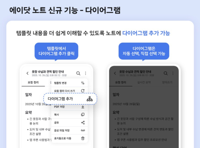 [디지털데일리정혜승기자]SK텔레콤이자사AI서비스‘에이닷(A.)’내기록관리기능인‘에이닷노트’의업데이트를실시했다고3일밝혔다.이번업데이트는텍스트시각화,폴더분류등기능으로효율성과편의성을끌어올린것이특징이다.우선‘다이어그램’기능이새롭게추가됐다.텍스트위주의길고복잡한회의록이나아이디어노트를직관적인도식형태로변환해주는기능이다.AI가자동으로단락을분석해다이어그램을추가하는‘자동선택’방식과사용자가원하는영역만지정하는‘직접선택’방식을지원한다.생성된다이어그램은3가지디자인중사용자가원하는형태를선택할수있다.이미지파일로스마트폰갤러리에다운로드하거나한노트내에여러개를추가하는것도가능하다.문서를공유받은타인도구조와핵심을빠르게파악할수있어업무협업에유용하다.노트관리의체계성도더했다.기존에는생성된노트가최신순으로만나열됐다면,이번에새롭게추가된‘폴더기능’으로사용자는원하는기준에맞춰문서를정돈할수있게됐다.회의록,일상,강의노트등유형별로나누거나개인과업무기록을분리해보관할수있어필요한노트를빠르게탐색할수있다.아울러앱내에서즉시내용을수정할수있는편집기능도도입됐다.기존에는녹음후정리된텍스트를확인하는용도에그쳤으나,이제는실시간요약문장과받아쓰기(STT)내용,템플릿까지앱안에서직접수정할수있다.이동중이거나PC사용이어려운환경에서도오타를고치거나떠오른아이디어를즉각보완할수있다.이밖에도정리된내용을상대방에게전달할때문서전체가아닌필요한부분만발췌해전달할수있는‘선택공유’기능이추가됐다.SK텔레콤은“이번업데이트는사용자경험개선에집중해일상의효율을높이는데초점을맞췄다”며“일상의기록을더체계적으로관리할수있다”고밝혔다.Copyright©디지털데일리.Allrightsreserved.무단전재및재배포금지.