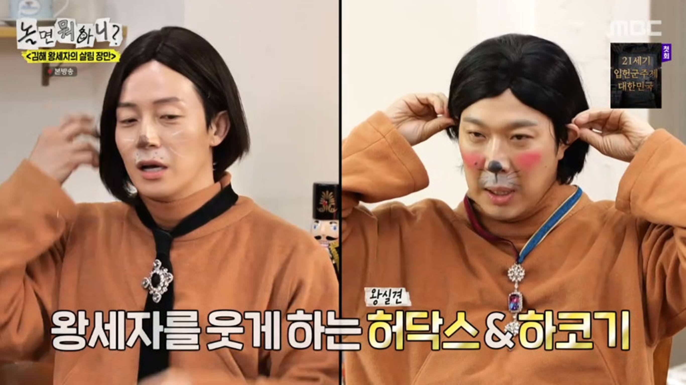 MBC'놀면뭐하니?'(엑스포츠뉴스김지영기자)코미디언허경환이'놀면뭐하니?'에서선보인개분장에허탈한모습을보였다.4일방송된MBC'놀면뭐하니?'에는코미디언양상국이'김해왕세자'콘셉트로등장해멤버들의보호를받으며서울나들이를즐긴모습이담겼다.이날하하와허경환은왕세자인양상국의'왕실견'콘셉트로강아지분장을한채등장했고,유재석과주우재는보디가드차림으로함께했다.양상국은등장하자마자하하와허경환을향해강아지를다루듯"앉아,일어서,손"을외치며훈련시키는모습을보여웃음을자아냈다.MBC'놀면뭐하니?'이어유재석은두사람을향해"왕실에서키우긴하지만혈통이없는애들아니냐.시골잡종아니냐"고농담을던졌고,하하는"나왕실에서태어났어.우리엄마가!"라고받아쳐웃음을더했다.이후다음장소로이동하던중유재석은하하와허경환을가리키며"성수동가면반려견케이스가있다.강아지들을다묶어줘야할것같다"고주우재에제안했다.이에양상국은"줄하나인데두마리묶는목줄이있다.그걸사달라"고말했고,주우재는"개산책시켜주는알바에맡겨놓자"고거들며웃음을유발했다.MBC'놀면뭐하니?'하하는"거기조심해.입함부로놀려오늘?"이라며목소리를높였고,허경환은"고정되자마자개분장하고,계속가발쓰고..."라며현타온모습을보여웃음을자아냈다.이어하하가양상국에게"저기입나온유재석사투리쓰지말라고해라"고하자,왕세자역할에몰입한양상국은"입"이라는짧은한마디로제지해또한번웃음을안겼다.사진=MBC'놀면뭐하니?'김지영기자[email protected]©엑스포츠뉴스.무단전재및재배포금지.