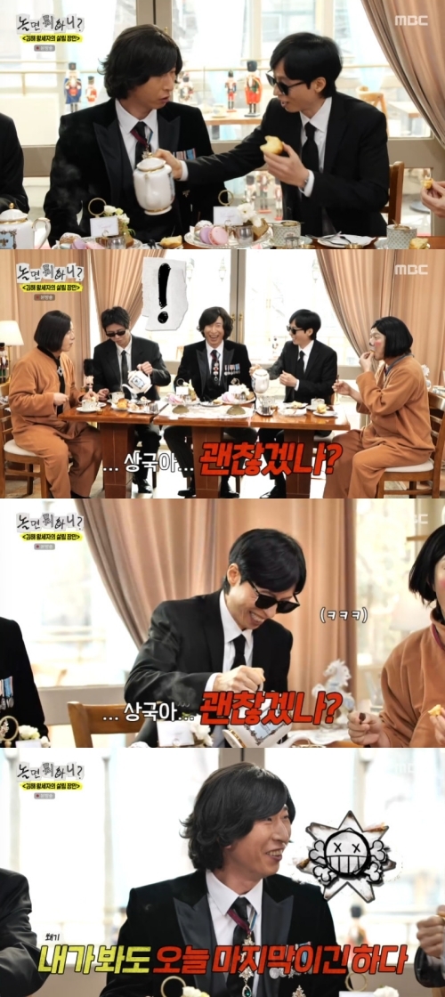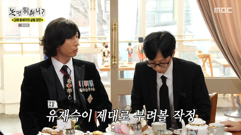 ‘놀면뭐하니’.사진IMBC허경환이유재석에대한양상국의하극상을보고걱정했다.4일오후방송된MBC예능프로그램‘놀면뭐하니?’(연출김진용장우성장효종왕종석,작가최혜정)에는‘김해왕세자’양상국과함께하는서울에서의하루가그려졌다.이날방송에서유재석과주우재는보디가드로,하하와허경환은왕세자만의왕실견인허닥스와하코기로변신했다.양상국은“오늘은진짜보디가드다.혹시나내말하는데끼어들거나사람들이근처에오면가만히안둔다”며카메라도본인만찍으라고소리쳤다.이를보던허경환은“양상국이‘개콘’에서콧물그리던놈이왕세자돼서.풍선돌리고너”라며못마땅한표정을지었다.이후에도양상국이차를따르는유재석에게“재석아두손으로해야지.빵놓고”라며명령하자허경환은“상국아,괜찮겠나?너무오래하는것같아서.동료로서”라며걱정해웃음을자아냈다.하하도“내가봐도오늘이마지막같다”라고쐐기를박아양상국을당황하게했다.MBC‘놀면뭐하니?’는매주토요일오후6시30분방송된다.[서예지스타투데이객원기자]Copyright©스타투데이.무단전재,재배포및AI학습이용금지