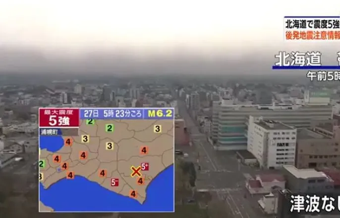 日기상청,지진규모6.1로발표했다6.2로수정[서울=뉴시스]일본홋카이도도카치지방남동부를진원으로하는규모6.2지진이27일오전5시23분께발생했다.사진은일본NHK보도장면갈무리.2026.04.27.<사진캡처=NHK>*DB및재판매금지.[서울=뉴시스]김예진기자=일본홋카이도(北海道)도카치(十勝)지방남동부호로조(浦幌町)를진원으로하는규모6.2지진이27일오전5시23분께발생했다.현지공영NHK,지지통신등에따르면일본기상청은당초지진규모를6.1로발표했다가6.2로상향수정했다.발생시간도5시24분에서23분으로수정했다.이번지진진원의깊이는약80㎞로발표했다가83㎞로수정했다.기상청은쓰나미(津波·지진해일)우려는없다고밝혔다.이번지진으로홋카이도호로조(浦幌町)등에서진도5강흔들림이관측됐다.일본기상청은지진의흔들림을진도0·진도1·진도2·진도3·진도4·진도5약·진도5강·진도6약·진도6강·진도7등10단계로나누고있다.계측진도계로자동측정해발표한다.진도0이가장낮은수준이다.진도5강은무언가잡지않으면걷기어려울정도의흔들림이다.선반에있던식기류,책이떨어지는일이많다.고정되지않은가구가쓰러지기도한다.홋카이도에서진도5강흔들림이관측된것은지난해12월이후처음이다.홋카이도전력에따르면홋카이도도마리무라(泊村)소재도마리무라원자력발전소에이상,피해는없었다.원전주변방사선량을측정하는모니터링포스트수치에도변화는없었다.일본정부는오전5시25분총리관저의위기관리센터에관저연락실을설치했다.정보수집,대응등에나섰다.다카이치사나에(高市早苗)총리는소셜미디어엑스(X)에글을올려"피해상황파악,국민에대한적확한정보제공등대응에전력을다하고있다"며"흔들림이상했던지역의여러분은계속같은정도지진발생에주의해달라"고강조했다.기상청지진·쓰나미과에비타아야타카(海老田綾貴)과장은이날오전기자회견을열어과거사례를거론하며"지진발생후약일주일정도,최대진도5강정도의지진에주의해달라"고촉구했다.그는"특히2~3일정도는규모가큰지진이발생하는일이많다"며거듭주의를당부했다.특히그는이번지진은지난20일산리쿠(三陸)앞바다에서규모7.7의강진이발생해내려진'홋카이도·산리쿠앞바다후발지진주의정보(이하주의정보)'대상지진은아니라고밝혔다.주의정보를새롭게발표할기준에해당하는지진도아니라고설명했다.주의정보는기존발령기간인27일오후5시에해제된다.에비타과장은주의정보는이날종료되지만"계속해(지진에)대비해줬으면한다"고촉구했다.☞공감언론뉴시스[email protected]©뉴시스.무단전재및재배포금지.