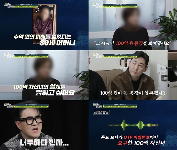 (사진제공=채널A'탐정들의영업비밀')-"100억통장보여줬는데..."80세노인속여돈+집다빼앗은30대女?현직변호사"보이스피싱조직과수법똑같아"경악!-"인간이아니다","역대급으로화가나"데프콘->김풍분노폭발...80세노인노린'100억자산녀'의상상초월사기극!'탐정들의영업비밀'이80세노인을가스라이팅해수억원을갈취한'100억원자산가'여성의충격적인실체를추적한다.12일(월)밤10시에방송되는채널A'탐정들의영업비밀'에는"어머니가자신을100억원자산가라고주장하는젊은여자에게속아,약5억원을빌려주고집까지저당잡혔다"는역대급사연이등장한다.의뢰인은"더큰문제는어머니가가스라이팅을당해아직도그여자를완전히믿고있다"며,100억원자산녀의실체를밝혀달라고도움을요청한다.사건의시작은의뢰인의어머니가소고기납품사업을한다는강씨(가명)일당에게5천만원을빌려주면서부터였다.그들은처음7개월동안은꼬박꼬박이자를지급하며신뢰를쌓았지만,어느순간돌연이자를끊어버렸다.이후불안해하던어머니앞에'100억원유산상속자'라며30대여성을소개했다."아버지는H건설사장,어머니는갤러리관장"이라고자신을소개한여성은,'100억원'이찍힌통장을직접보여주며두사람의빚을대신갚겠다고나섰다.그런데"보증을잘못서통장이압류가된상태"라며,압류해지를위한자금이필요하다고덧붙였다.그때부터100억원자산녀는'빌려달라'는명목으로의뢰인어머니의모든현금자산을가져가더니,돈이바닥나자지인들의돈까지끌어오도록압박했다.뿐만아니라어머니가은행대출을받도록유도하고,텔레뱅킹비밀번호를요구해어머니의계좌에서직접돈을빼가는등할수있는모든수법을동원해돈을빼앗았다.여기서그치지않고쉼없이쏟아지는100억원자산녀의만행에'탐정들의영업비밀'스튜디오는"인간이아니다","속으로아는욕은다했다","역대급으로화가난다"등분노로들끓는다.특히남성태변호사는"보이스피싱조직과다를바없는심각한사기행위"라고지적하며,의뢰인의어머니를감쪽같이속아넘어가게만든'100억원통장'의실체를파헤친다.끝내의뢰인의어머니를응급입원까지하게만든100억원자산녀의악행,그리고상상을뛰어넘는그녀의정체는1월12일월요일밤10시채널A'탐정들의영업비밀'방송을통해낱낱이공개된다.Copyright©채널A.Allrightsreserved.무단전재,재배포및AI학습이용금지