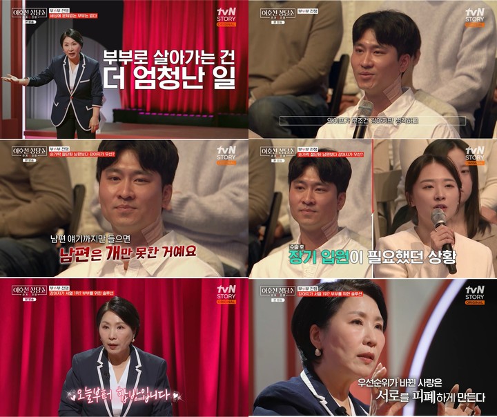 (MHN김설기자)반려견을향한아내의과도한애정으로인해각방위기에처한신혼부부의사연이시청자들에게큰충격을안겼다.20일방송된tvNSTORY'이호선상담소'에서는결혼2년차를맞았으나반려견을둘러싼갈등으로'부부전쟁'중인김포거주부부가출연했다.이날방송에서남편은"아내가무조건강아지만생각한다"며서운함을토로했고,급기야반려견문제로각방까지쓰고있는현재의상황을고백했다.특히모두를경악게한것은남편의손가락절단사고당시아내의대처였다.남편은"일하다손가락이절단되어병원에입원했는데,아내가다음날'강아지가혼자집에있어안된다.유치원에데려다주고다시오겠다'며병실을비웠다"고폭로했다.이에패널장영란은"정말서운했을것같다"며말을잇지못했고,방청객들사이에서도탄식이터져나왔다.아내는"남편의장기입원이예상되어짐도챙길겸,강아지를호텔에맡기려했던것"이라고항변했다.유기견출신에2kg밖에되지않는작은체구의반려견이눈에밟혔다는것.아내는강아지양육비로한달에많게는100만원까지지출한다고밝혀놀라움을더했다.사연을들은이호선교수는아내의따뜻한마음에는공감하면서도단호한일침을가했다.이교수는"남편의입장에서보면본인이개만도못한존재로느껴질수있다"며"생명은소중하지만분명한우선순위가있다.현재아내의세계에서는순서가뒤집어졌다"고지적했다.이어"강아지가서열1위가아니라남편이1위가되어야한다.아내의1순위는남편이어야한다"며"서로가인생의우선순위임을잊지말고,남편을외롭게하지말라"고조언했다.전문가의명쾌한진단에남편은그제야화색을띠며안도하는모습을보였다.한편,tvNSTORY'이호선상담소'는매주화요일오후8시에방송된다.사진=tvNSTORY'이호선상담소'방송화면Copyright©MHN.무단전재및재배포금지.