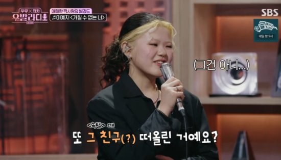 SBS예능프로그램'무무X차차우발라디오'방송화면캡처(엑스포츠뉴스오수정기자)'우발라디오'에서이예지가전남자친구언급에난감해했다.13일방송된SBS예능프로그램'무무X차차우발라디오'(이하'우발라디오')에서는'우리들의발라드'톱12(김윤이최은빈천범석정지웅이예지홍승민임지성송지우이지훈이준석민수현제레미)과특별한게스트가꾸미는듀엣무대가펼쳐졌다.전현무와차태현은'우발라디오'첫방송반응이뜨거웠다고시청자들에게고마움을전했다.이어차태현은"저는'우리들의발라드'본방송보다재밌었다"고말했다.이에전현무는"부담이없으니까마음껏노래를부르더라"고말하면서"그리고우리둘의조합고좋고,톱12의선곡센스도미쳤다는반응이많더라"고했다.차태현은"그런데DJ들이노래욕심이너무많은것같다는소수의견도있었다"면서웃었고,이에자랑곳하지않는전현무와차태현은또노래를불러웃음을자아냈다.이후첫번째코너'줄수있는게이노래밖에없다'가진행됐다.전현무는"제가소개할이번사연은중학교시절의제얘기같아서고르지않을수가없었다.정말공감이많이됐다"면서사연을읽었다.사연의내용은16살중학생이두살많은고등학생누나를짝사랑하고있다는내용이었다.누나에게첫눈에반했지만,누나는이미다른남자를좋아하고있다고.사연자는포기가안되어서혼자서좋아하고있는데,누나를잊어야할지고백을해야할지고민이라고했다.차태현은사연자에게"방송을통해고백해보는건어떠냐"고제안했고,사연자는"그냥많이좋아하고있다고말하고싶다"고고백해스튜디오를달달하게물들였다.이후전현무는이예지를호명했다.이예지는'우리들의발라드'경연당시에이은미의'녹턴'을부르면서눈물을흘렸고,그이유가전남자친구때문이라고고백한바.이예지는"저도짝사랑을해봤기때문에"라면서뱅크의'가질수없는너'를선곡해서열창했다.이예지는경험에서묻어나오는깊은감정으로무대에몰입하게했다.무대후전현무는이예지에게"또그전남자친구를떠올렸냐"고물었고,이예지는대답을제대로하지못했다.차태현은"다른친구야?"라고놀랐고,전현무도"빠르다?"라면서이예지를놀려웃음을자아냈다.사진=SBS방송화면오수정기자[email protected]©엑스포츠뉴스.무단전재및재배포금지.