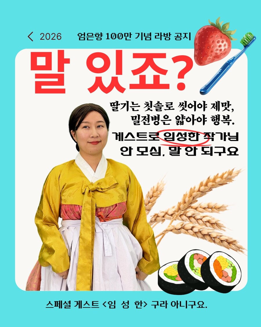 ▲엄은향.출처ㅣ엄은향인스타그램[스포티비뉴스=강효진기자]'닥터신'의임성한작가(피비,phoebe)가데뷔이래처음으로유튜브라이브방송에나선다.유튜버엄은향은14일자신의SNS에"엄은향X임성한스페셜게스트로모신다지?100만구독기념첫라이브방송많관부.2026.4.17금요일오후7:45유튜브엄은향채널"라는글을남기며100만구독자기념라이브방송공지를남겼다.함께공개된이미지에는"말있죠?딸기는칫솔로씻어야제맛,밀전병은얇아야행복.게스트로임성한작가님안모심말안되구요"라며"라이브는라이브로보는게이치고도리구요"라고임성한스타일의홍보문구를공개해웃음을자아냈다.지난6일유튜버엄은향은자신의인스타그램스토리에임성한작가와라이브방송을진행한다는긴급공지를올렸다.엄은향은"임성한작가클리셰","약속에늦었을때임성한드라마특징","영화'기생충'임성한작가버전"등의콘텐츠로꾸준히임성한작가에대한애정을드러내온인기유튜버다.엄은향은"긴급공지라지.임성한작가님께연락왔다지"라며임성한작가특유의대사톤으로공지를올렸다.이어"다음주'엄은향'100만구독기념첫라이브합니다.게스트는임성한작가"라고덧붙였다.1990년데뷔한임작가는드라마'보고또보고','하늘이시여','인어아가씨','오로라공주','결혼작사이혼작곡'등다양한히트작을집필한스타작가다.그러나언론노출을좀처럼하지않아많은부분이알려져있지않은신비주의로도유명하다.특유의개성이강한대사,빨려드는화법등이MZ세대사이에서도화제를모으며임성한작품다시보기열풍까지이어지고있다.이번라이브방송은외부에노출을꺼리던임성한작가가직접제안해성사된파격적인만남으로화제를모으고있다.과연라이브방송에나선임작가가어떤모습으로누리꾼들과소통에나설지주목된다.<저작권자ⓒSPOTVNEWS.무단전재및재배포금지>Copyright©스포티비뉴스.무단전재및재배포금지.