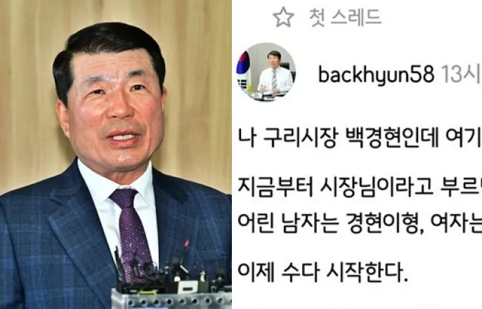 백경현구리시장과그가최근SNS에남긴글./사진=뉴스1,스레드백경현경기구리시장(68)이SNS(소셜미디어)에서반말로친근한소통을시도했다가과거행적을지적하는비판댓글이잇따르자결국게시물을모두삭제했다.백시장은최근SNS에"나구리시장백경현인데여기가반말로소통하는데라며?지금부터시장님이라고부르면차단(농담)"이라며"1958년생보다어린남자는경현이형,여자는경현쓰~라고해.이제수다시작한다"고적었다.해당글은시민들과의소통을바라며올린것으로보이지만,실제누리꾼들반응은차가웠다.누리꾼들은과거백시장의행적을비판하는댓글을남겼다.앞서지난해7월수도권집중호우로공무원들이비상근무를하는동안백시장은강원홍천군한야유회에서춤추며노래해논란에휩싸인바있다.당시이재명대통령은국무회의에서"국민이죽어가는엄혹한현장에서음주가무를즐기거나대책없이행동하는정신나간공직자들에대해아주엄히단속하길바란다"고질타했다.백시장은같은날성명을내고"신중하지못한결정을했다.전적으로제잘못이었다"며사과했다.다만야유회에20분정도참석했으며술은마시지않았다고덧붙였다.지난해7월수도권집중호우로공무원들이비상근무를하는동안강원홍천군한야유회에서춤추며노래하는백경현구리시장의모습./사진=SBS뉴스유튜브갈무리이에대해한누리꾼은"시민들이강물에떠내려가는데'흘러가는강물처럼'노래를불렀다고한다.시민안전이걸린위급한상황에서도책임감은커녕기껏내놓은변명이'술은안마셨다'였다.나는당신같은무능한형을둔적없다"는댓글을달았다.2022년11월대구에서열린신천지행사에백시장이축전을보낸사실도언급됐다.당시백시장은행사주최단체를정확히인지하지못했다고해명했다.관련기사를댓글로공유한누리꾼은"경현아이거왜보냈어?"라고되물었다.과거부적절한행태를꼬집는댓글들이이어지자결국백시장은모든SNS글을삭제한상태다.류원혜기자[email protected]©머니투데이&mt.co.kr.무단전재및재배포,AI학습이용금지.