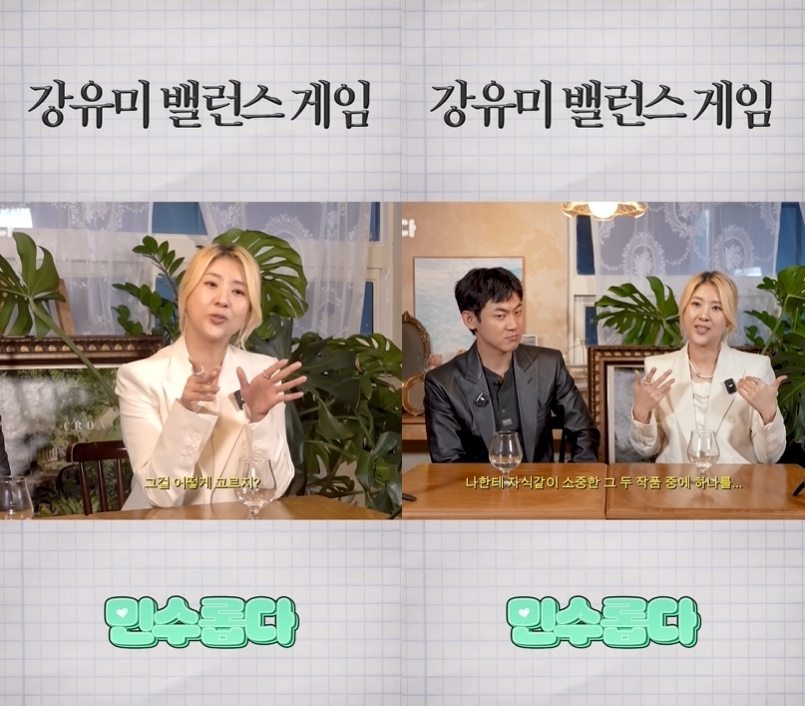‘피식대학PsickUniv’채널캡처[뉴스엔김명미기자]코미디언강유미가톱배우패러디로웃음을안겼다.최근온라인커뮤니티를통해강유미가출연한'민수롭다'쇼츠영상이화제를모았다.특히지난달8일공개된'강유미밸런스게임'영상이뜨거운반응을얻고있다.이날톱배우로빙의한강유미는두작품중최애작품하나를꼽아달라는제작진의밸런스게임요구에"게임이면내가골라야하냐"고반문했다.이어"자식처럼소중한작품중하나를,거기투입된수많은스태프들의피땀어린노력,치열한노력을우열을가리라는?어디서재미를느껴야되냐"고반응했고,김민수는"그러네"라며강유미의편을들었다.또김민수는스태프들에게"얘들아,이런거앞으로하지말자"며'갑질'연기를펼쳤다.이에누리꾼들은강유미의연기력에"이런건강유미가사실원톱임"등댓글을남기며뜨거운반응을보이고있다.특히일부누리꾼들은"스태프들무례한질문나만불편했던게아니었네.민수배우님이잘캐치해서분위기잘풀어진것같네요"등'민수롭다'세계관에빠져든댓글을남겨웃음을안겼다.뉴스엔김명미mms2@기사제보및보도자료[email protected]ⓒ뉴스엔.무단전재&재배포금지Copyright©뉴스엔.무단전재및재배포금지.