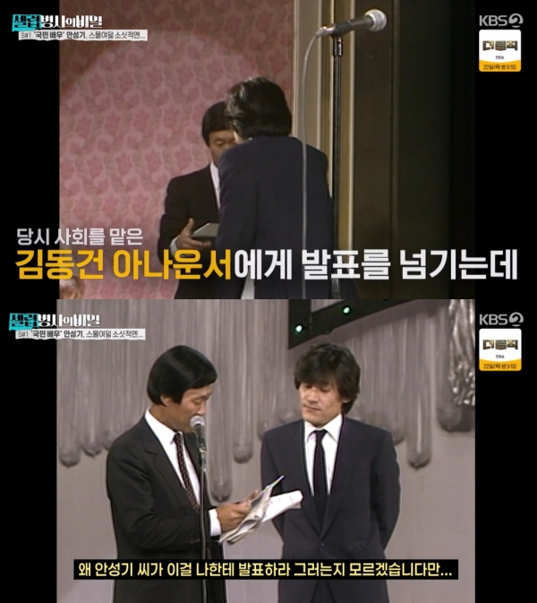사진=KBS2셀럽병사의비밀캡처[스포츠투데이송오정기자]배우고(故)안성기의스물여덟시절의모습이공개됐다.그시절,시상식에서있었던영화같은일화가눈길을끈다.20일방송된KBS2'셀럽병사의비밀'(이하'셀럽병사')에서안성기의인생과영화사를돌아보는시간을가졌다.스물여덟무렵의안성기는영화'바람불어좋은날'을촬영중이었다.감독의기대와사뭇다른이미지탓에혼도많이났다.이에안성기는중국집견습생으로들어가배달일을배울정도로역할에동화되고자했다.이후안성기는제19회한국연극영화예술상시상식(백상예술대상전신)에전년도수상자로서영화부문남자연시상시상자로무대에올랐다.발표자가적힌큐카드를보던안성기는곤란한듯,돌연진행자인김동건아나운서에게다가가발표를미루는모습을보였다.그러자김동건아나운서는"안성기씨가왜나에게발표하라했는지모르겠습니다만,안성기씨가또상을받는군요.그래서저에게"라고대리발표했다.전년도수상자가시상자로나와재차수상하게된상황이었던것.김동건아나운서는수상자인안성기에게소감을묻자,"제가당황해서그래서김동건씨에게달려갔다"라고설명했다.이모습을본장도연은"이장면이영화같다"라며감탄했다.[스포츠투데이송오정기자[email protected]]Copyright©스포츠투데이.무단전재및재배포금지.