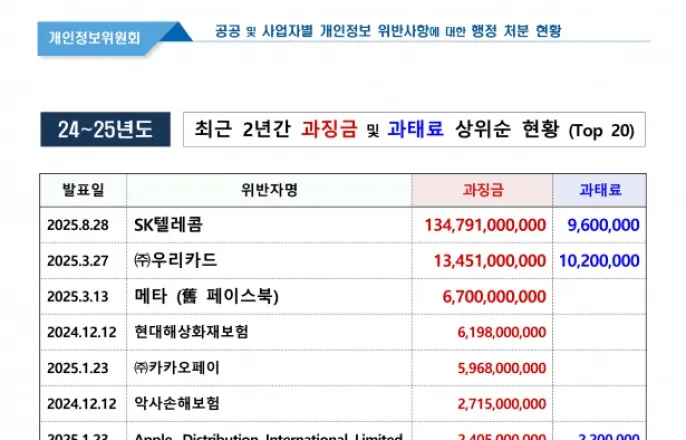 정보보안인정협회집계...공병철회장"인증심사원국가에서보수지급해야"(지디넷코리아=김기찬기자)개인정보보호위원회(개인정보위)로부터지난해100억원이넘는과징금을받은기업은2곳으로집계됐다.2024년말부과받은쿠팡과현대해상화재보험을포함하면10억원이넘는과징금을받은기업도10곳으로나타났다.27일정보보안인정협회(회장공병철)가개인정보위공고문에따라집계·분석한최근2년간개인정보위과징금및과태료상위순20개기업을보면,SK텔레콤,우리카드등기업이개인정보보호법위반으로100억원이넘는과징금을부과받은것으로조사됐다.(아래도표참조)가장많은과징금을부과받은SK텔레콤은지난해4월께발생한유심해킹사태로1347억9100만원의과징금철퇴를맞았다.여기에더해과태료도960만원을부과받았다.출처=정보보호인정협회개인정보위에따르면개인정보보호법제64조의2에따라위반사항이발견될경우과징금을부과한다.이어동법제75조에따른위반사항이적발될경우에는과태료를부과한다.과징금과과태료를같은기준으로동시에적용할수없으며,명확한기준은법령에따라나뉘지만크게사안의중대성에따라과징금과과태료사항이나뉜다.SK텔레콤에이어우리카드는지난해3월말께개인정보위로부터134억5100만원의과징금을맞았다.앞서우리카드는가맹점주7만4천여명의개인정보를동의도받지않고마케팅에활용한사항이적발돼과징금을물게됐다.10억원이상의과징금을부과받은기업은높은순으로▲메타67억원▲현대해상화재보험61억9800만원(과태료102만원)▲카카오페이59억6800만원▲악사손해보험27억1500만원▲애플24억500만원(220만원)▲알리익스프레스19억7800만원(780만원)▲섹타나인1477억7700만원(720만원)▲SK스토아14억3200만원(300만원)▲비와이엔블랙야크13억9100만원▲쿠팡13억1000만원등이다.이외에도최근2년간과징금을받은기업및기관으로는▲테무WhalecoTechnologyLimited8억7900만원(과태료176만원)▲모두투어네트워크7억4700만원(과태료102만원)▲월드코인재단7억2500만원▲전북대학교6억2300만원(과태료540만원)▲법무법인로고스5억2300만원(과태료690만원)▲동행복권5억300만원(과태료480만원)▲엔에이치엔위투5억300만원(과태료480만원)▲테무ElementaryInnovationPte.Ltd.4억9000만원등이다.공병철정보보안인정협회장은"정보보호및개인정보보호관리체계인증(ISMS-P)등이의무화됐고과징금부과기준도매출의3%에서10%로상향조정됐다"면서도"그러나ISMS-P인증심사를받기위한기업들이비용을셀프로지출하고있으며,인증심사원도심사에따른보수가25년전금액과똑같은수준이현재까지유지되고있다"고지적했다.그는"개인정보위가확보한과징금재원을바탕으로이같은인증을국고에서수행토록하며,인증심사원역시국가에서보수를지급함으로써심사의투명성을더욱제고할수있어야한다"며"이처럼명확한재원활용방안이마련되지않으면과징금부과기준의상향도정책적명분을얻을수없다"고강조했다.김기찬기자([email protected])Copyright©지디넷코리아.무단전재및재배포금지.