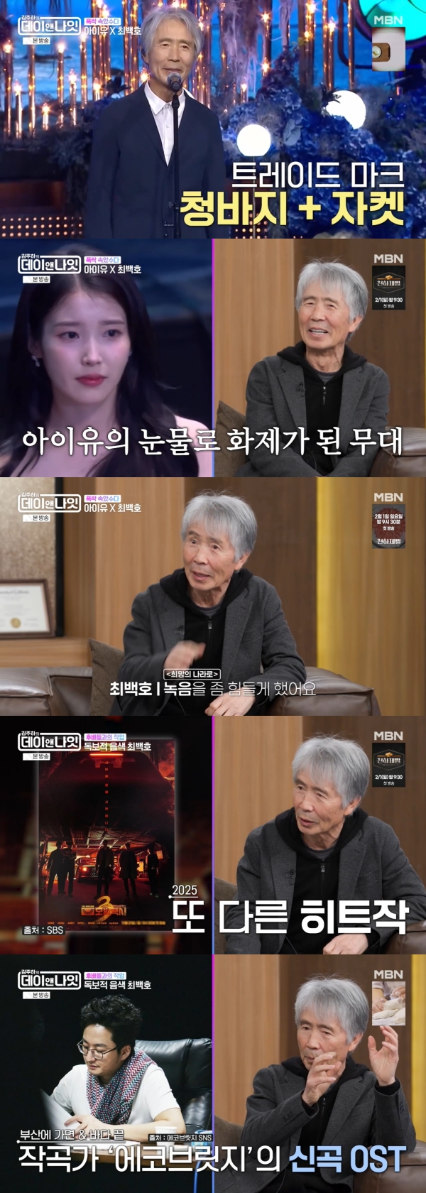사진=MBN[스포츠투데이김태형기자]가수최백호가아이유등후배들과의작업을떠올렸다.17일방송된MBN'김주하의데이앤나잇'에는데뷔50년차가수최백호가출연했다.이날조째즈는아이유가2013년에발표한곡인'아이야나랑걷자'를언급했다.해당곡은최백호가피처링한듀엣곡으로사랑을받았다.넷플릭스'폭싹속았수다'의OST였던최백호의'희망의나라로'에대한이야기도나왔다.지난해'청룡시리즈어워즈'에서아이유가여우주연상을받았을때최백호는'희망의나라로'로축하공연을한바있다.당시아이유가눈물을글썽이는모습으로화제를모았다.최백호는"사실저노래가제체질은아니다"라며"녹음을좀힘들게했다.단순해보이는데잘안되더라"라고밝혔다.이어"그런데'폭싹속았수다'가크게히트를쳤다"고말했다.이어"조금지나니또전화가왔다"며SBS'모범택시3'를언급했다.그는작곡가에코브릿지의신곡OST작업에참여한것에대해"에코브릿지가제목소리를나름대로제일매력적인부분이어떤음정인지까지다파악하고,그음정위주로곡을썼다.그렇게'기다려야지'란곡을받고'이거참좋다'고생각했다.내매력적인부분은고음이아니라중저음에서나오는구나를알게됐다.저도앞으로그렇게곡을써야겠다"고말했다.최백호는앞으로함께작업해보고싶은가수로조째즈를꼽았다.이에조째즈는최백호의'찰나'를부르며화답했다.[스포츠투데이김태형기자[email protected]]Copyright©스포츠투데이.무단전재및재배포금지.