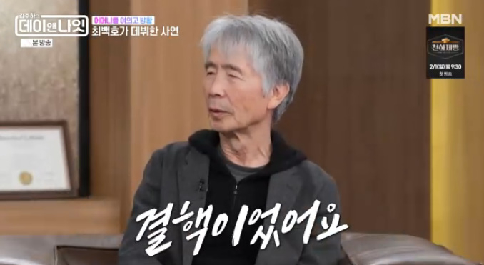 [스타뉴스|한해선기자]/사진=MBN'김주하의데이앤나잇'방송캡처3MC김주하,문세윤,조째즈가최백호를만나고눈물이터졌다.17일방송된MBN토크쇼'김주하의데이앤나잇'에는데뷔50주년을맞은최백호가게스트로출연했다.최백호는처음가수가된계기로"어머님이저20살때돌아가셨다.저에게어머니는특별한존재였다.아버지가일찍돌아가시고삼남매를낳았다보니생활이어려웠지만장손이고독자인저를어머니가애지중지했다.제가스무살이됐을때어머니가돌아가시고상실감에군대에들어갔다"고이야기를시작했다./사진=MBN'김주하의데이앤나잇'방송캡처최백호는"군대에들어갔는데심하게운동을했고그걸못이겨내고결핵에걸렸다.군대에선감염이될까봐결핵환자는바로제대를시켰다.그해71년12월31일에입대1년만에결핵으로제대했다"라고밝혔다.그는"이후에어렵게살고있을때친한형이'매형이부산서면에서나이트클럽을오픈하는데네가노래한번해보는게어떻겠냐'라고하더라.가수들이펑크가나면제가올라가고했다.일주일쯤지났는데부산MBC'별이빛나는밤에'배경모진행자가찾아와서라이브클럽출연을묻더라.그때부터운이풀렸다"라고전했다.한해선기자[email protected]©스타뉴스&starnewskorea.com,무단전재및재배포금지