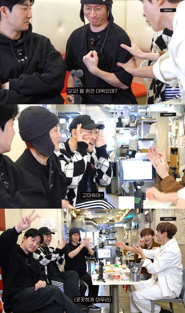 에픽하이[티브이데일리한서율기자]그룹에픽하이가세븐틴유닛도겸,승관과함께유쾌한웃음을선사했다.에픽하이는지난15일유튜브채널‘에픽카세(EPIKASE)’를통해‘에픽하이텐션에기빨리고영혼털린세븐틴승관도겸.ft.동네분식’이라는제목의영상을공개했다.영상에서타블로는“에픽하이를젊고잘생기게만들면이렇겠다”라며도겸과승관을소개했다.특히타블로는딸하루를위해직접산세븐틴응원봉을가져와사인을요청하며“부석순팬”이라고밝혔다.미쓰라는내향형인‘I’라서처음에는낯을가렸지만이내애교를부리며낯가림을풀었고,투컷은DJ인데도콘서트에서목이쉬었다며말을자제해웃음을자아냈다.하루가태어나기전부터자주왔다는단골분식집에서메뉴를모두시킬기세로주문을마친에픽하이와도겸,승관은운동을통한근육부심을부렸다.도겸과승관은타블로의가슴근육을만져보며“생각보다엄청단단하다”라고말했고,이들은서로를캡틴아메리카와토르로비교했다.이가운데도겸이30대에접어들었다는점에기립박수를보내며“웰컴투아저씨브로”라고축하했다.도겸과승관의유닛이름을‘관겸’으로지어준에픽하이는두사람의1위를미리축하했다.특히타블로는두사람의국내음원차트1위를넘어빌보드1위를점쳤고,승관은“사실느낌이오긴했다”면서상황극을이어받아웃음을자아냈다.이가운데에픽하이는음원차트1위보다유튜브조회수100만이더짜릿하다면서유튜브중독증세를보였고,세븐틴의‘고잉세븐틴’이유튜브콘텐츠의기준점이된다면서서로의고민을나눴다.도겸과승관의신곡‘소야곡’을들은뒤에픽하이는세븐틴의데뷔초기를돌아봤다.대기실에인사왔던세븐틴을떠올린에픽하이는“버논이‘쇼미더머니’왔을때세븐틴이라는팀의존재를인지했다”고말했다.이가운데승관은넬(Nell)김종완과친분이있다고밝혔고,타블로는“그형이랑있으면사람이그늘진다”며장난섞인질투를보였다.특히타블로는승관이우울할때김종완을찾는다고하자“우리가훨씬더웃겨줄수있다”며언제든찾아오라고말했다.세븐틴은데뷔10년이상이되면서회사와의관계,재계약등에대해고민했다.이에투컷은“약간의까칠함을보여줘야회사에서함부로하지않는다”라며명언을남겨공감대를형성했다.에픽하이는30대를앞두고있고,데뷔15주년을향해가는도겸과승관에게“너희처럼성공하고치열하게20대를보낸사람은0.1%뿐”이라며찬사를보냈고두사람의성공을빌며콘텐츠를마무리했다.한편에픽하이는매주유튜브콘텐츠를통해음악을넘어일상과관계를풀어낸다양한주제의영상으로팬들과꾸준히소통을이어가고있다.[티브이데일리한서율기자[email protected]/사진=에픽하이공식유튜브채널'에픽카세'영상캡처]에픽하이[Copyrightⓒ*세계속에新한류를*연예전문온라인미디어티브이데일리(www.tvdaily.co.kr)/무단전재및재배포금지]Copyright©티브이데일리.무단전재및재배포금지.