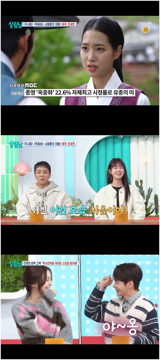 <리뷰:방송시청후작성된리뷰기사입니다.>[OSEN=오세진기자]'살림남2’배우진세연이박서진의귀여움이좋다고표현했다.17일방영된KBS2TV예능'살림남2'에서는배우진세연이등장했다.진세연은오랜만에드라마로복귀하며많은시선을받았다.데뷔때부터뚜렷한이목구비와고운목소리로주목을받았던진세연은여전한낭랑한목소리로박서진을감동시켰다.이요원은“남자스타일어떠냐”라며물었다.진세연은“어릴때는상남자를좋아했는데,나이가드니서진씨같은귀여운스타일이좋다”라고말했다.박서진은“야옹”이라며답했다.진세연은“엄마랑‘살림남2’를되게재미있게본다.엄마가박서진을정말좋아한다”라며박서진을칭찬했다.이요원은“진세연에게미안한데,세상에남자가살림남출연하는다섯명,은지원,이민우,지상렬,박서진,타쿠야가있으면누구를선택하겠냐”라며밸런스게임을냈다.진세연은“저는박서진이다.귀여운스타일을좋아한다”라고말해박서진을설레게했다./[email protected][사진출처]KBS2TV예능'살림남2'방송화면캡처Copyright©OSEN.무단전재및재배포금지.