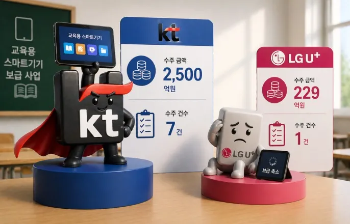 작년에만7건수주···1건따낸LGU+수주액은229억작년전국시도교육청의교육용스마트기기보급사업에서KT가LG유플러스를제치고2500억원가량을수주했다./이미지=챗GPT[시사저널e=김용수기자]KT가작년전국시도교육청의교육용스마트기기보급사업으로만2500억원에달하는금액을따낸것으로나타났다.스마트기기보급사업은디지털교육을위한스마트패드를정부기업간거래(B2G)로공급하는것이다.KT가작년따낸전국시도교육청의사업은건수로는7건에달하며LG유플러스계열이229억원규모의사업단1건만을따낸것을고려하면KT가이시장에서LG유플러스를한참앞서고있는셈이다.다만윤석열정부가중점적으로추진한'인공지능(AI)디지털교과서'도입이이재명정부에서동력을잃으면서,AI디지털교과서에접속하기위한필수매개체인스마트기기의올해보급사업규모는다소축소될것으로보인다.28일시사저널e취재를종합하면작년진행된8건의전국시도교육청의스마트기기보급사업에서KT가LG유플러스(자회사LG헬로비전포함)를제치고7건을수주한것으로확인됐다.7건의사업금액을합산하면2484억8360만원에달한다.구체적으로작년7월충청남도교육청의'2025년수업용스마트기기지원사업'에서KT컨소시엄은LG유플러스컨소시엄과포유디지탈컨소시엄을제치고32억6460만원의사업을따냈다.같은해8월세종특별자치시교육청의'2025년학교교육용스마트기기보급사업에따른물품구매'사업에서도KT컨소시엄은LG유플러스컨소시엄과롯데이노베이트컨소시엄을제치고136억1230만원의사업을따냈다.같은달약377억4196만원에달하는경기도교육청의'2025년도학교스마트기기보급및유지관리'사업도KT컨소시엄이LG유플러스컨소시엄과포유디지탈컨소시엄을제치고수주에성공했다.이어KT컨소시엄은작년9월제주특별자치도교육청의110억1094만원에달하는제주특별자치도교육청의'2026학년도중학생스마트기기지원사업'에서LG유플러스컨소시엄과CJ올리브네트웍스컨소시엄을제치고우선협상대상자로선정됐다.작년11월18억6360만원규모의충청남도교육청'2025년2차수업용스마트기기지원사업'도KT컨소시엄에게돌아갔다.같은달KT컨소시엄은LG헬로비전컨소시엄을제치고서울특별시교육청이발주한'2026학년도디벗환경구축사업'을수주했다.총사업금액은1562억105만원이다.디벗은서울시가AI·디지털교과서를도입하기위해학생들에게배포하는태블릿PC다.2024년에는LG헬로비전컨소시엄이KT컨소시엄을제치고1842억2359만원에달하는해당사업을따낸바있다.올해사업에서KT가LG헬로비전을꺾고1000억원대사업을수주한것이다.이밖에KT컨소시엄은작년12월진행된광주광역시교육청의'2026년교육용스마트기기및충전보관함보급사업'입찰경쟁에서도LG헬로비전컨소시엄과CJ올리브네트웍스컨소시엄,롯데이노베이트컨소시엄을제치고사업을따냈다.해당사업금액은247억8915만원이다.LG유플러스가작년스마트기기보급사업에서수주에성공한것은대구광역시교육청(대구시교육청)발주사업이유일하다.LG유플러스컨소시엄은작년4월대구시교육청의'2025년학교스마트기기보급'사업에서KT컨소시엄과CJ올리브네트웍스컨소시엄을제치고수주에성공했다.사업금액은229억3923만원이다.이처럼KT가작년전국시도교육청의스마트기기보급사업에서LG유플러스를크게앞섰지만,올해예정된스마트기기보급사업은예년보다치열한경쟁은없을것으로보인다.이재명정부에서AI디지털교과서도입이동력을잃으면서스마트기기보급사업의규모축소가불가피할것으로예상되기때문이다.작년8월초·중등교육법개정안이국회본회의를통과하면서AI교과서의법적지위가'교과서'가아닌'교육자료'로낮아진바있다.사실상AI교과서가퇴출수준이라는평가가나오는이유다.Copyright©시사저널e무단전재및재배포금지