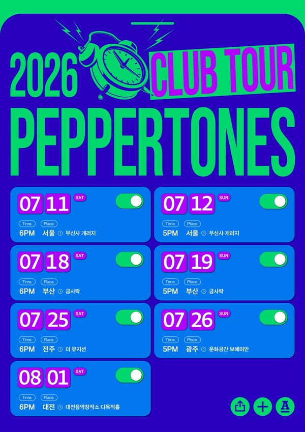 ▲페퍼톤스클럽투어포스터.NOL티켓과29CM를통해오는5월6일오후7시서울공연예매가시작된다.이어NOL티켓을통해5월6일7시30분부산,5월7일오후6시30분전주·7시광주·7시30분대전공연예매가차례로시작된다.제공|안테나[스포티비뉴스=김원겸기자]밴드페퍼톤스가전국5개도시에서클럽투어를연다.페퍼톤스(신재평,이장원)는지난27일공식SNS를통해'2026페퍼톤스클럽투어'포스터를게재하며,클럽투어개최소식을알렸다.공개된포스터는스마트폰알람화면을본뜬디자인으로눈길을끈다.활성화된알람버튼과함께각투어일정이적힌가운데,페퍼톤스만의경쾌한밴드사운드로관객들의눈과귀를깨울전망이다.공개된일정에따르면,페퍼톤스는오는7월11~12일서울을시작으로7월18~19일부산,7월25일전주,7월26일광주,8월1일대전까지전국5개도시를순회하며관객들과만난다.페퍼톤스는2012년부터꾸준히클럽투어를진행하며관객들과밀접히호흡했다.이번에도페퍼톤스만의따뜻한멜로디와노랫말로긍정에너지를전할전망이다.특히,페퍼톤스는최근성황리에마친단독공연'페퍼톤스어쿠스틱라이브:안락'을통해잔잔한어쿠스틱감성을아우르며색다른매력을전한데이어,이번클럽투어를통해서는페퍼톤스표밴드사운드의진수를선사할것을예고해더욱기대를모은다.<저작권자ⓒSPOTVNEWS.무단전재및재배포금지>Copyright©스포티비뉴스.무단전재및재배포금지.