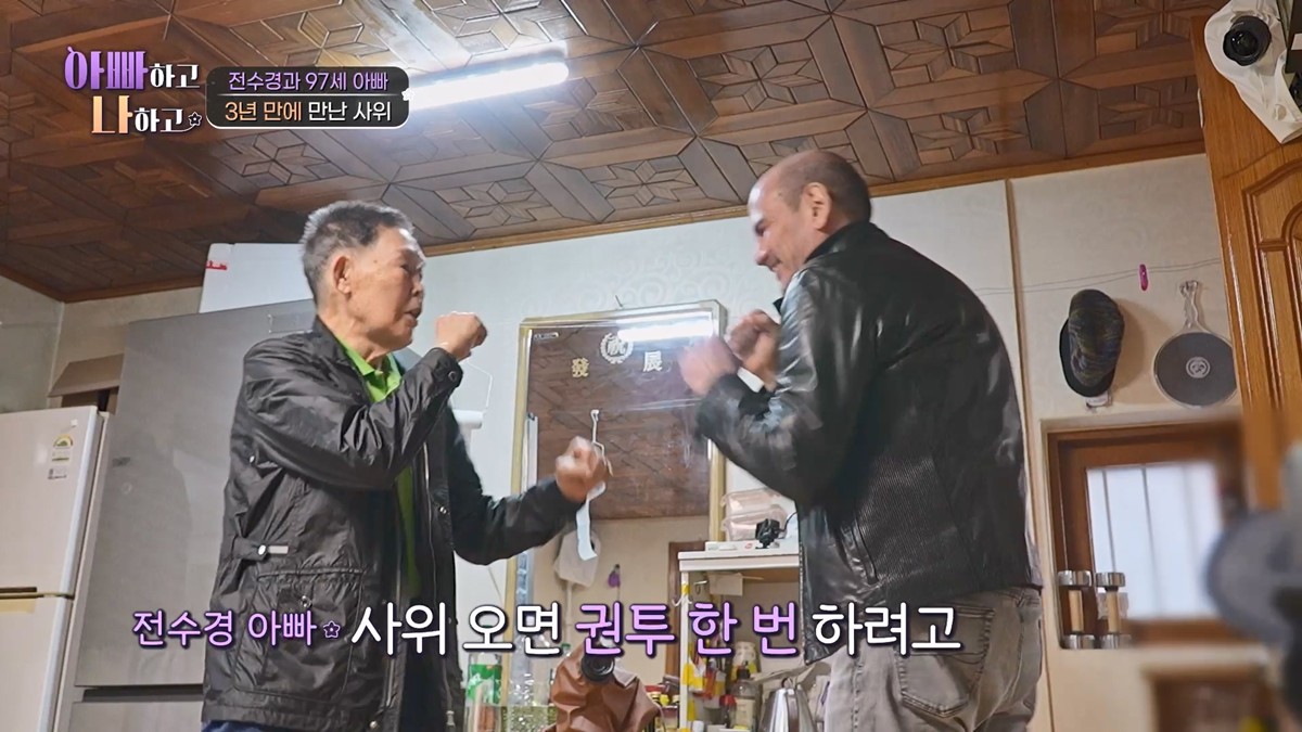TVCHOSUN‘아빠하고나하고시즌3’캡쳐(엑스포츠뉴스정연주기자)전수경의아빠가사위에릭과3년만에재회한가운데,애정가득한권투대결을펼친다.29일방송되는TVCHOSUN‘아빠하고나하고시즌3’에서는전수경의외국인남편에릭스완슨이전수경아버지와3년만에재회하는모습이그려진다.전수경의남편에릭은인터컨티넨탈호텔총지배인으로,현재대만에서일하며전수경과‘롱디부부’로지내고있다.TVCHOSUN‘아빠하고나하고시즌3’캡쳐딸이오랜만에사위와함께집에온다는소식에‘97세’전수경아버지는옛이발소스타일대로뜨거운수건을얹어모공을열어준뒤일회용면도기로턱,볼,이마까지얼굴전체를거침없는손길로면도하며꽃단장을한다.제초기급면도질에한혜진은“다치실까봐걱정된다”라고놀라기도했지만이어“아버님피부비결인가”라며흥미로워하고,전현무는“최고령그루밍족이다”라며남다른관리법에감탄했다.거친꽃단장후손꼽아기다리던사위가들어오자전수경아버지는옆에있는딸도그대로지나쳐사위에릭을힘차게끌어안는다.TVCHOSUN‘아빠하고나하고시즌3’캡쳐이어전수경아버지는“사위오면권투한번하려고”라며권투자세를잡고,이에사위에릭또한전수경아버지의주먹질을받아주며환영의권투시합을펼쳐웃음을자아낸다.한바탕의주먹질후두사람은다시끌어안았고,전수경아버지는“찌릿찌릿하다.이맛에만나고싶은거다”라며행복해한다.자연스러운스킨십에스튜디오는“서로스킨십이자연스럽다.처음본다”라며남다른장서지간에놀라고특히결혼20년차인현주엽도“장인어른은세상어렵다.포옹한번못해봤다”라며신기해한다.TVCHOSUN‘아빠하고나하고시즌3’캡쳐그렇게서로를반겼지만,전수경아버지와에릭은통역을맡아줄전수경이자리를비우자스튜디오는적막함으로가득찬다.적막을깨기위해에릭이용기내“저올해67세예요”라며대화를시도했지만,알아듣지못한전수경아버지는어색한미소와함께끄덕거리며딸만기다린다.알고보니전수경은아버지와남편이자신이부재중일때어떤모습일지궁금해일부러자리를피한것이었고,에릭은“아버지와둘만있던적이거의없다”며장인어른과처음보내는둘만의시간에긴장한듯한모습을보인다.TVCHOSUN‘아빠하고나하고시즌3’캡쳐언어의장벽에부딪힌전수경아버지와사위에릭이어떻게함께시간을보낼지,두사람사이의거리감을좁힐수있을지관심이쏠린다.한편이날전수경아버지,전수경,그리고에릭의나들이에는뜻밖의손님이찾아오는데,갑작스레들이닥친무리에에릭은당황했고차츰웃음기를잃어간다.VCR을지켜보던한혜진은“영혼이없어졌다”며에릭을안타까워했고,김정태역시“이정도면3일입원각이다”라며혀를내두른다.과연에릭을방문한깜짝손님은누구일지그정체는29일오후10시에확인할수있다.사진=TVCHOSUN정연주기자[email protected]©엑스포츠뉴스.무단전재및재배포금지.