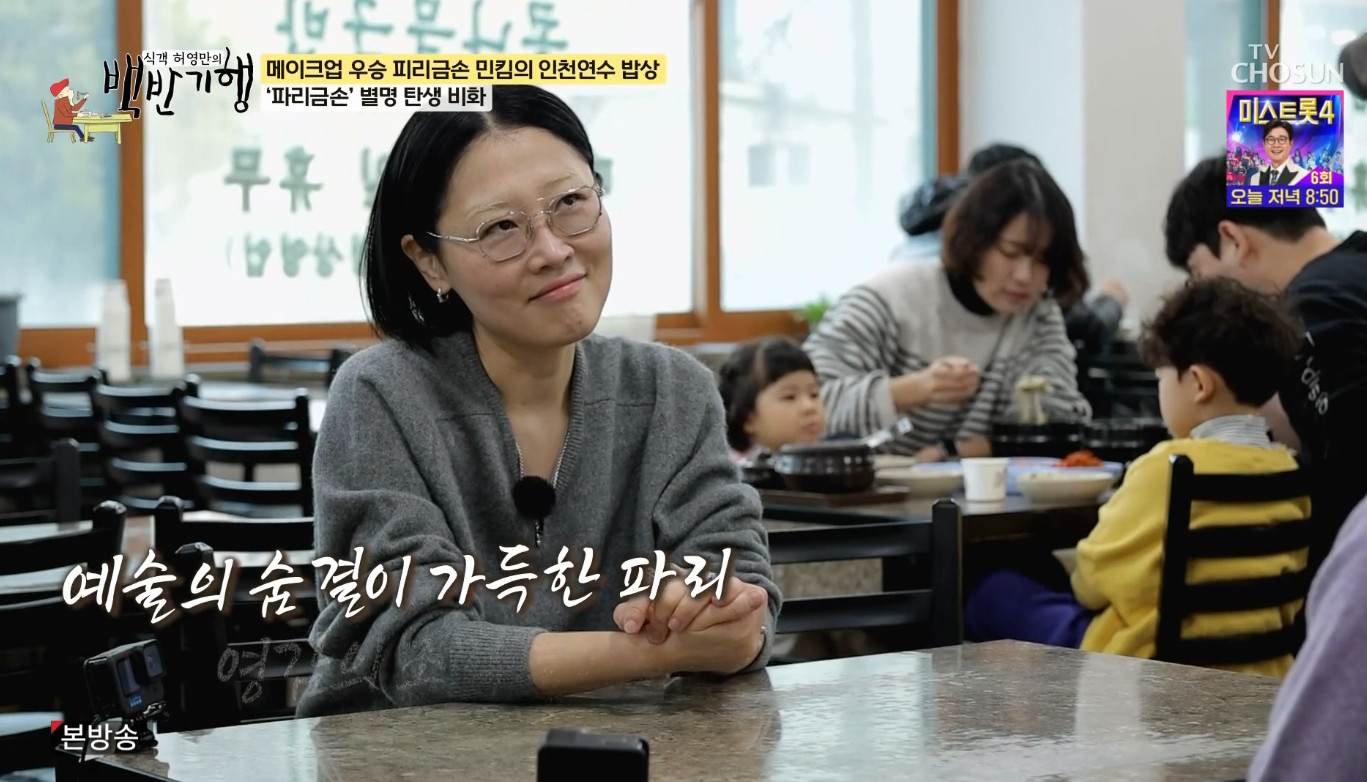 (엑스포츠뉴스황수연기자)'저스트메이크업'우승자민킴이파리에가게된사연을밝혔다.25일방송된TV조선'식객허영만의백반기행'(이하'백반기행')에서는쿠팡플레이'저스트메이크업'우승자'파리금손'민킴이게스트로출연했다.이날민킴은"어떻게프랑스를가게됐냐"는질문에"메이크업학원을다닐때경연에서1등을하면파리연수를2주정도시켜줬다.그때한번파리를가봤다.그리고나서'나나가야겠다'생각했다"고답했다.별명인'파리금손'에는"얼마전에메이크업콘테스트프로그램에참여했는데파리에서온금손이라고해서불린이름이파리금손이었다"고설명했다.한편민킴은"프랑스에서돼지를어떻게먹냐"고묻는허영만에게"구워도먹고졸여서먹기도한다.저는무조건삼겹살수육을먹는다.와인이랑같이먹으면세상부러울게없다"고답했다.사진=TV조선황수연기자[email protected]©엑스포츠뉴스.무단전재및재배포금지.