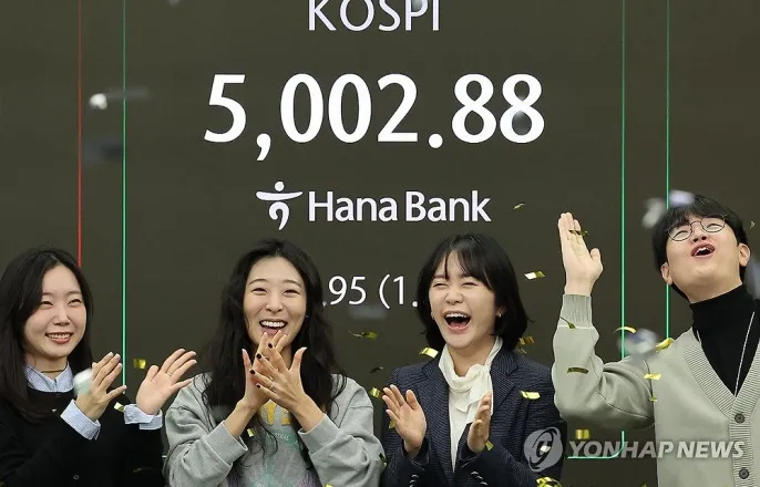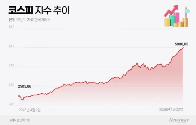 장기상승전망속단기과열신호감지외국인·기관은삼성전자·SK하이닉스집중매수개인,네이버·반도체주에대규모순매수코스피꿈의'5000시대'개막···증시역사새로썼다(종합)기사의사진코스피지수가사상최초로5000선을돌파하며국내증시에새로운역사를썼다.지난해4월2일2500선에서마감한코스피는불과9개월만에2배수준으로증가하며주요국대비월등한성과를기록중이다.22일한국거래소에따르면이날코스피는전장보다77.13포인트(1.57%)오른4987.06으로출발해5000포인트를돌파한뒤5019.54포인트까지오르며사상최고치를경신했다.이는지난해10월4000선을처음돌파한이후3개월만이다.지난해4월2일2505.86으로마감한지수가불과9개월만에2배이상급등한것이다.코스피는지난21일종가기준1월한달동안16.5%오르며2000년이후월간기준역대4번째높은수익률을기록했다.코스피5000포인트돌파를이끈핵심주체는개인투자자다.개인은지난해1월2일부터올해1월21일까지약9조3414억원을순매수했다.같은기간외국인과기관투자자는각각1941억원,24조5191억원을순매도했다.개인은지난1년간네이버에3조원가량을투입하며가장많이순매수했다.SK하이닉스(2조3210억원),현대차(2조780억원),삼성SDI(1조6547억원)등이뒤를이었다.반면외국인은삼성전자(6조7734억원),한국전력(1조7488억원),한화에어로스페이스(1조3016억원)등을매수했다.기관은SK하이닉스(5조9637억원),삼성전자(2조1950억원),KB금융(1조6953억원)등을매수했다.코스피는'종합주가지수'라는이름으로1980년1월4일시작했다.당시유가증권시장전체시가총액은100으로설정됐다.코스피가5000선고지를점령했다는말은유가증권시장시가총액이1980년에비해50배이상증가했다는의미다.코스피는1989년3월31일최초로1000을돌파하며네자릿수시대에진입했다.1992년에는외국인직접투자가전면허용되면서본격적인글로벌시장진출을시작했다.하지만1997년국제통화기금(IMF)여파로이듬해6월16일277.37까지내려앉았다.코스피는IMF이후체질개선과정보기술(IT)투자열풍에힘입어1999년1000선으로복귀했으나IT거품설과9·11테러로다시400선까지내려갔다.2007년7월에는경제회복과펀드투자열풍등으로2000대로올라가며삼천피시대에대한기대감을키웠다.하지만2008년금융위기로1000선밑으로추락했다.2017년에는도널드트럼프1기행정부가촉발한미중무역갈등등의여파로하락세를보였다.2020년3월은코로나19직격탄을맞아추락하다가개인매수세가유입된동학개미운동으로급반등해2021년1월삼천피에도달했다.2024년말에는윤석열정부의비상계엄여파등으로2399.49로마감했다.이후이재명정부가출범하면서증시부양책에대한기대감이커졌고,지난해6월3000포인트를회복했으며,10월27일4000시대에진입했다.코스피는지난해1년동안75.9%오른상승세를유지하며이날5000포인트돌파에성공했다.증권가에서는코스피지수5000포인트돌파이후강세장경로가유지될것으로전망한다.최재원키움증권연구원은"코스피가가파른랠리를펼치고있는핵심동력은실적과유동성"이라며"메모리반도체업황호조에기반한반도체이익전망치가가파르게상향된결과연초이후코스피12개월선행EPS는16.8%상승했다"고밝혔다.이어"최근주식시장으로머니무브가가속화됨에따라고객예탁금도20일기준95조5000억원을기록하며역대최고치까지증가한상태"라며"1월말SK하이닉스와미국주요빅테크기업실적발표이후코스피의추가적인이익레벨업이가능하다"고평가했다.이재명정부의생산적금융전환과국민성장펀드RAI계좌등투자세제지원목적의세법개정등을감안하면실적과유동성에기반한상승경로는지속유지될것으로보인다.다만일각에서는단기적인속도조절을염두해야한다는지적이나온다.연초이후가파른속도로코스피가상승한결과120일이동평균선기준코스피이격도가현재129.9%를기록해2002년이후역대최대치를보이고있기때문이다.최연구원은"최근지정학적갈등이관세불확실성을재차야기하고,일본국채금리상승과같이추가적으로글로벌금리상승이유발될수있다는점을경계해야한다"며"이같은상황이국내증시의추세적인경로를바꿀이슈는아니지만,연초이후기술적과열국면에진입한국내증시에단기적인조정빌미를제공할수있다"고언급했다.김성수기자[email protected]©뉴스웨이.무단전재,재배포,AI학습이용금지