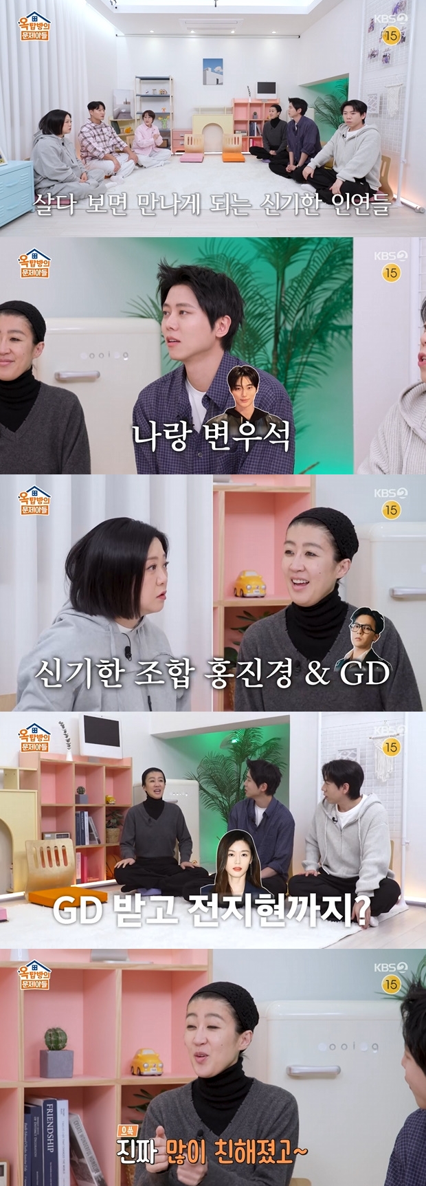 티브이데일리포토[티브이데일리김진석기자]'옥탑방의문제아들'MC들의의외의인연에대해말했다.9일방송된KBS2예능프로그램'옥탑방의문제아들'(이하'옥문아')에는케이윌,안재현이게스트로출연해다양한이야기를나눴다.이날방송오프닝에서MC들은뜻밖의인연에대해말했다.송은이는"살다보면예상하지못한인연을만날때도있다"라고말했고,김숙이"나랑라미란?"이라고말하자양세찬은"색채가좀비슷하다"라고말했다.주우재는"저랑변우석"이라고말해공감을얻었다.김숙은"홍진경GD(지드래곤)"이라고말했고,주우재는"이누나도전지현씨"라고거들었다.홍진경은"지현이는진짜이제좀많이친해졌다.같이카톡하는사이다.GD는가끔내가DM보내면답은온다"라며친분을자랑했다.이어뜻밖의인연으로케이윌과안재현이등장했다.김종국은다이어트에성공한케이윌을보고"형수관리좀했다"라고칭찬했다.[티브이데일리김진석기자[email protected]/사진=KBS2'옥문아']옥문아[Copyrightⓒ*세계속에新한류를*연예전문온라인미디어티브이데일리(www.tvdaily.co.kr)/무단전재및재배포금지]Copyright©티브이데일리.무단전재및재배포금지.