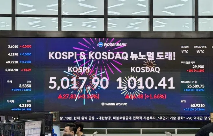 코스피,5020선넘어신고점달성코스닥,외인·기관수급이끌며상승세[서울=뉴시스]코스피가전거래일(4990.07)보다7.47포인트(0.15%)상승한4997.54에개장한26일오전우리은행전광판에지수가표시되고있다.코스닥지수는전거래일(993.93)보다9.97포인트(1.00%)오른1003.90에거래를시작했다.원·달러환율은전거래일주간거래종가(1465.8원)보다19.7원내린1446.1원에출발했다.2026.01.26.[서울=뉴시스]김진아기자=국내증시가유례없는강세를이어가고있다.코스피는'오천피'재탈환에성공한데이어코스닥은1000포인트를넘어서며역사적신고점을새로썼다.26일한국거래소에따르면이날9시49분현재코스피지수는전장대비5.77포인트(0.12%)오른4995.84를가리키고있다.지수는이날7.47포인트오른4997.54에출발해장초상승폭을키우며5000선을재돌파했다.장시작15분여만에5023.76을터치하며신고점을갈아치운후오름폭을줄이면서5000선부근에서등락을거듭하고있다.개인이유가증권시장에서2088억원을순매수하며지수상승을견인하고있다.외국인과기관은각각658억원,1470억원을순매도중이다.시가총액상위종목들은혼조세를보이고있다.삼성전자는전장대비1.38%오른15만4200원에,SK하이닉스는2.22%내린75만원에각각거래중이다.현대차는1.37%하락한50만3000원을기록하고있다.코스닥지수는지난주장중사상최고치를기록한데이어'천스닥'고지를넘어섰다.같은시각코스닥지수는전장대비34.15포인트(3.44%)오른1028.08을가리키고있다.지수는이날9.97포인트오른1003.90에출발해상승폭을늘리는모습이다.코스닥이장중1000포인트를넘긴것은지난2022년1월6일(1003.01)이후4년여만이다.외국인과기관이각각1226억원,5800억원을순매수하며수급개선을이끌고있다.반면개인은나홀로6509억원을순매도중이다.코스닥시총상위종목모두강세다.알테오젠(2.97%),에코프로비엠(9.41%),삼천당제약(7.64%),HLB(4.36%),코오롱티슈진(8.18%),리가켐바이오(9.22%),펩트론(5.71%)모두상승세다.에코프로(10.10%),레인보우로보틱스(23.38%),에이비엘바이오(16.16%)는두자릿수상승률을기록하며지수상승을지지하고있다.이날서울외환시장에서원·달러환율은전거래일주간거래종가(1465.8원)보다19.7원내린1446.1원에출발했다.☞공감언론뉴시스[email protected]©뉴시스.무단전재및재배포금지.
