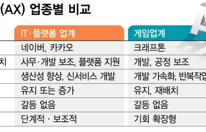 네이버·크래프톤,기존업무효율화수단…AX시대고용충격'0'제조업은'노동자대체'가능성,현대차노사갈등본격화AI전환(AX)업종별비교/그래픽=최헌정AX(인공지능전환)를맞이한업계별온도차가상당하다.AI(인공지능)도입에앞장선네이버·카카오등IT(정보기술)업계와게임업계에서는AX를고용충격없이진행중이다.반면현대자동차에서는휴머노이드로봇'아틀라스'도입을둘러싼노사갈등이본격화됐다.26일금융감독원전자공시시스템에따르면네이버임직원수는6월기준2023년4318명에서2025년4856명으로2년간538명(12.4%)증가했다.AI·클라우드·커머스등신사업확장국면에고용규모가커졌다.카카오는같은기간3917명에서3986명으로비슷한수준을유지했다.경제협력개발기구(OECD)가한국노동연구원과함께발간한보고서'AI와한국노동시장'(ArtificialIntelligenceandtheLabourMarketinKorea)에따르면AI를도입한한국기업의95.5%가"부서단위에서고용규모변화가없거나오히려늘었다"고답했다.응답자의56.5%는기존업무의일부를AI가대체하고있다고답했다.AI가업무방식과생산성을바꿨지만고용구조를직접흔들지는않았다는의미로풀이된다.게임업계에서는AI가사람을대체하는대신개발효율을끌어올리는도구로자리잡았다.개발공정은디지털이지만결과물은여전히고도의창작과협업을요구하기때문이다.게임사들은NPC(비조작형캐릭터)행동설계,밸런스테스트,버그탐지등반복작업에AI를활용한다.게임기획단계에도보조수단으로쓰인다.창작의대체가아니라개발속도와완성도를높이는장치로AI가인식된다.한국콘텐츠진흥원조사에따르면게임산업의생성형AI활용의향은58.8%로콘텐츠산업중가장높았다.AI활용률은41.7%에달했다.크래프톤등대형게임사들은AI활용을확대하면서도고용을유지한다.크래프톤직원수는2023년6월1802명에서지난해6월1926명으로124명늘었다.게임업계관계자는"AI도입이후에도개발인력을줄이는대신프로젝트수를늘리거나고부가영역으로재배치하는방식이일반적"이라고말했다.제조업의AI는물리적공정에직접투입되는'피지컬AI'가주류다.작업동작과역할자체를수행하는기술이라생산성개선과고용구조변화가동시에거론된다.'아틀라스'논란은AX가현장의심리적저항에부딪친사례로해석된다.제조업의휴머노이드로봇은노동자의노동전체를대체할잠재력이있기때문이다.도입속도조절이나중단이해법이아니라는데업계안팎의공감대가있다.현대차의로봇전략은비용,생산성,글로벌경쟁측면에서합리적이라는평가다.다만AX설계가노동자개인까지충분히고려하지못했다는점이갈등원인으로꼽힌다.OECD는보고서에서"AI가아직한국에서대규모고용감소로이어졌다는증거는제한적"이라면서도"AI전환과정에서노동자참여와재교육이부족할경우기술도입이갈등으로비화할수있다"고경고했다.김평화기자[email protected]©머니투데이&mt.co.kr.무단전재및재배포,AI학습이용금지.